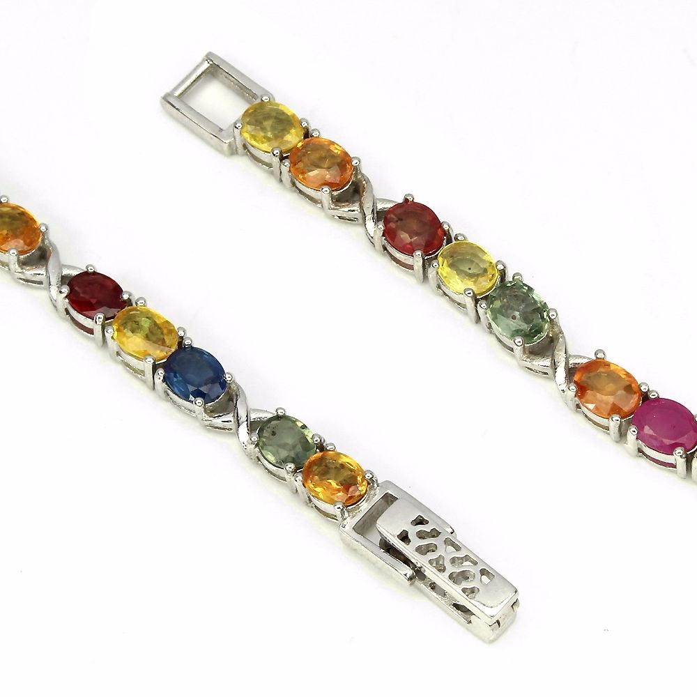 925 STERLING SILVER;PLATE-14K WHITE GOLD;LENGTH (INCHES)7.5;MAIN STONE-SAPPHIRE;OTHER GEMS-RUBY;TOTAL WEIGHT51.96 CT (TOTAL WEIGHT OF SILVER + STONE);DIMENSION* STONE 5.0 X 4.0 MM. * FACE BRACELET 170.0 X 5.0 MM.;MAIN STONE SHAPE-OVAL CUT;MAIN STONE COLOR-MULTI-COLOR;CLARITY/GRADE-IF TO VVS;TREATMENT-UNHEATED;ORIGINSONGEA - AFRICA;HARDNESS9.0