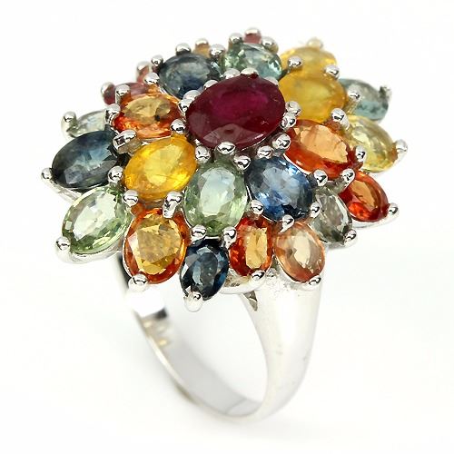 RUBY & FANCY SAPPHIRE (NATURAL) 14K WHITE GOLD COATING 925 SILVER RINGUNIT OF ITEM (S):1 PIECEWEIGHT (CT.):40.73 CT. (total weight of silver + stone);DIMENSION:* STONE 4.0 X 3.0 OT 7.0 X 5.0 MM. * RING SIZE 8.5 * FACE RING 26.0 X 20.0 MM.SHAPE/CUT:OVAL FACET;COLOR:TOP FANCY COLORS;CLARITY/GRADE:TRANSPARENT;LUSTER:GORGEOUS;TREATMENT; HEATED;ORIGIN:AFRICA & SONGEA - AFRICA;HARDNESS:9.0