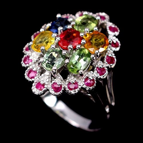 FANCY SAPPHIRE & RUBY (NATURAL) 14K WHITE GOLD COATING 925 SILVER RING;UNIT OF ITEM (S):1 PIECE;WEIGHT (CT.):32.59 CT. (total weight of silver + stone)DIMENSION:* STONE 1.5 TO 5.0 X 4.0 MM. * RING SIZE 8.5 * FACE RING 23.0 X 17.0 MM.;SHAPE/CUT:OVAL & ROUND FACET;COLOR:TOP FANCY COLORS;CLARITY/GRADE:TRANSPARENT;LUSTER:GORGEOUS;TREATMENT:HEATED & UNHEATED;ORIGIN: AFRICA;HARDNESS:9.0