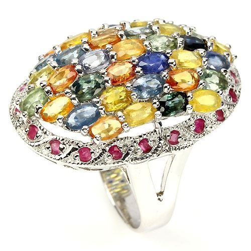 FANCY SAPPHIRE & RUBY (NATURAL) 14K WHITE GOLD COATING 925 SILVER RING;WEIGHT (CT.):63.47 CT. (total weight of silver + stone)DIMENSION:* STONE 1.5 TO 5.0 X 3.0 MM. * RING SIZE 9.5 (can be resized)* FACE RING 33.0 X 23.0 MM.;SHAPE/CUT:OVAL & ROUND FACET;COLOR:TOP FANCY COLORS;CLARITY/GRADE:TRANSPARENT & IF TO VVS;LUSTER:MESMERIZING;TREATMENT:UNHEATED & HEATED;ORIGIN:SONGEA - AFRICA & AFRICA;HARDNESS:9.0