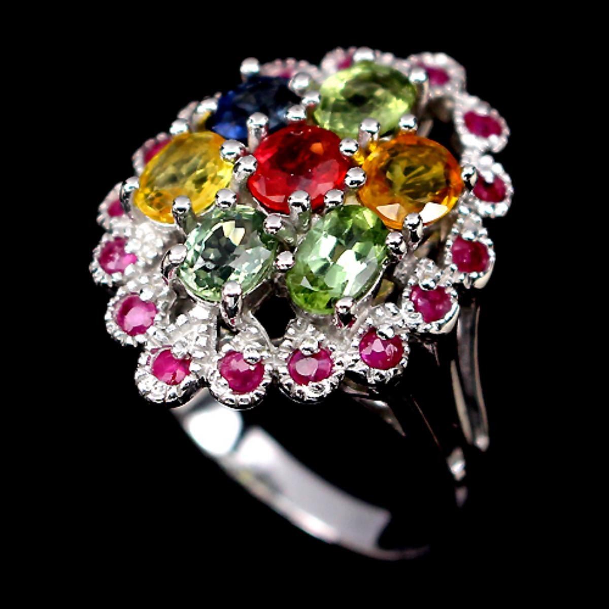 FANCY SAPPHIRE RUBY (NATURAL) 14K WHITE GOLD COATING 925 SILVER RING;UNIT OF ITEM (S):1 PIECE;WEIGHT (CT.):32.59 CT. (total weight of silver + stone)DIMENSION:* STONE 1.5 TO 5.0 X 4.0 MM. * RING SIZE 8.5 * FACE RING 23.0 X 17.0 MM.;SHAPE/CUT:OVAL ROUND FACET;COLOR:TOP FANCY COLORS;CLARITY/GRADE:TRANSPARENT;LUSTER:GORGEOUS;TREATMENT:HEATED UNHEATED;ORIGIN: AFRICA;HARDNESS:9.0