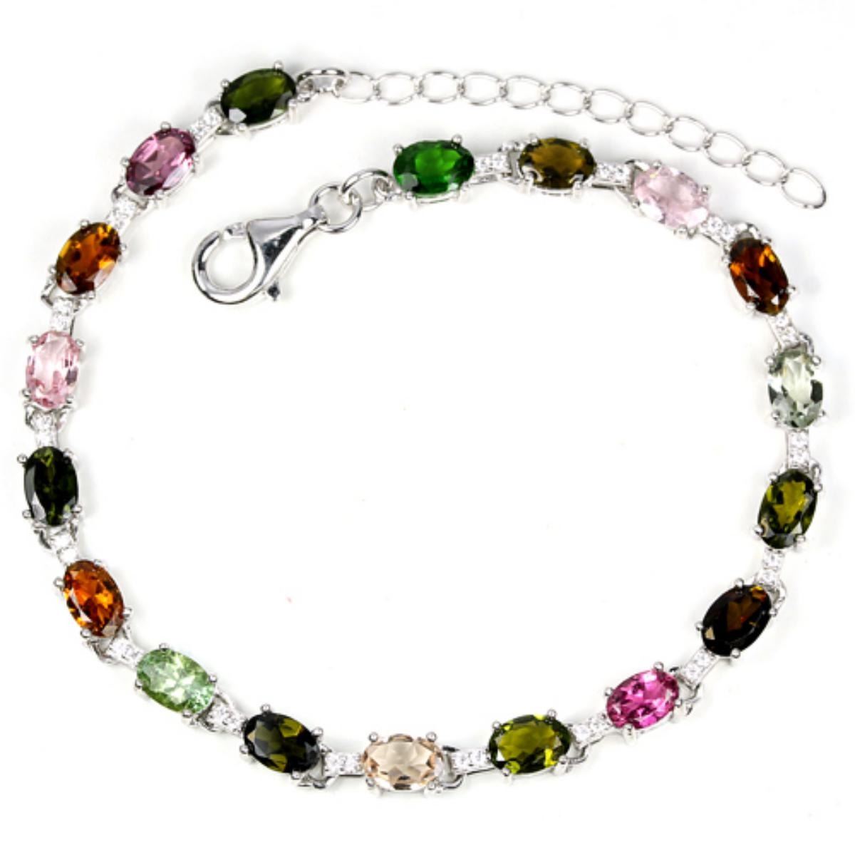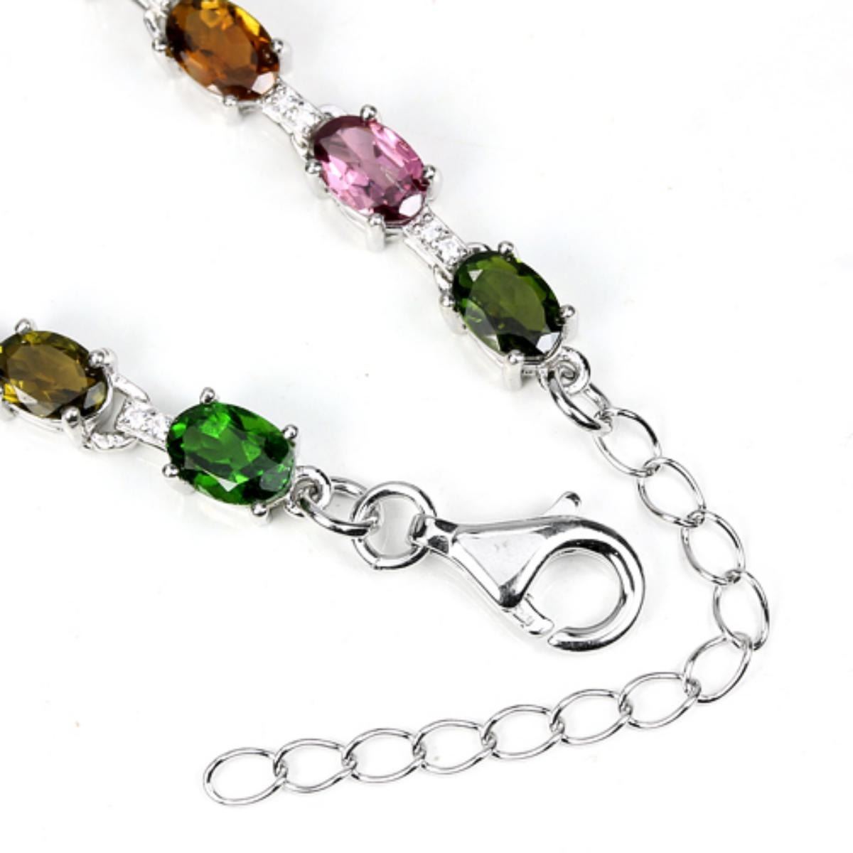 REAL TOURMALINE CHROME DIOPSIDE CZ 925 SILVER BRACELET 14K WHITE GOLD COATING; LENGTH OF ITEM (Inch.)8.75 ( RESIZE : NO )ITEM QUANTITY-1;STONE SHAPE-OVAL;STONE DIMENSION-6 X 4 MM.;ITEM WEIGHT-8.1 GRAM;COLOR-MULTI COLOR;CLARITY-IF,VVS TO SI;LUSTER-BEAUTIFUL;TREATMENT-NATURAL UNHEATED;ORIGIN OF STONE-AFRICA RUSSIA;HARDNESS-5 - 7.5;WHITE CUBIC ZIRCONIA 1 MM.