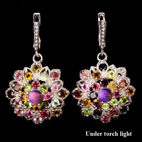 OPAL & FANCY TOURMALINE (NATURAL) 14K WHITE GOLD COATING 925 SILVER EARRINGS;UNIT OF ITEM (S):2 PIECES;WEIGHT (CT.):106.90 CT. (total weight of silver + stone)DIMENSION:* STONE 3.0 TO 5.0 MM. * FACE EARRINGS 42.0 X 26.0 MM.;SHAPE/CUT:ROUND CABOCHON & ROUND FACET;COLOR:TOP FANCY COLORS;CLARITY/GRADE:TRANSPARENT & IF TO VVS;TREATMENT:UNHEATED;ORIGIN:ETHIOPIA & BRAZIL;HARDNESS:5.5 - 7.5;Note- picture is taken under torch light otherwise opal looks white in daylight