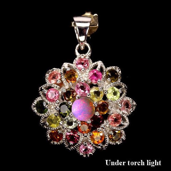 OPAL FANCY TOURMALINE (NATURAL) 14K WHITE GOLD COATING 925 SILVER PENDANT;WEIGHT (CT.):48.68 CT. (total weight of silver + stone);DIMENSION:* STONE 3.0 TO 5.0 MM. * FACE PENDANT 35.0 X 26.0 MM.;SHAPE/CUT:ROUND CABOCHON ROUND FACET;COLOR:TOP FANCY COLORS;CLARITY/GRADE:TRANSPARENT IF TO VVS;TREATMENT:UNHEATED;ORIGIN:ETHIOPIA BRAZIL;HARDNESS:5.5 - 7.5;Note- this picture is taken under torch light....otherwise opal looks white in daylight