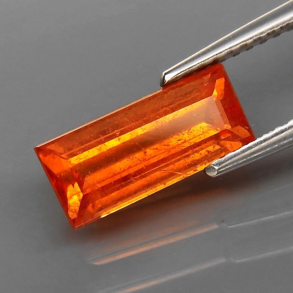 Spessartite Garnet SHAPE Baguette WEIGHT 3.30 Ct.SIZE 11.5 X 5.2 X 4.5 mm QUANTITY 1 Piece COLOR Fanta Orange ; LUSTER Superior ORIGIN Namibia TREATMENT None HARDNESS 7-7.5