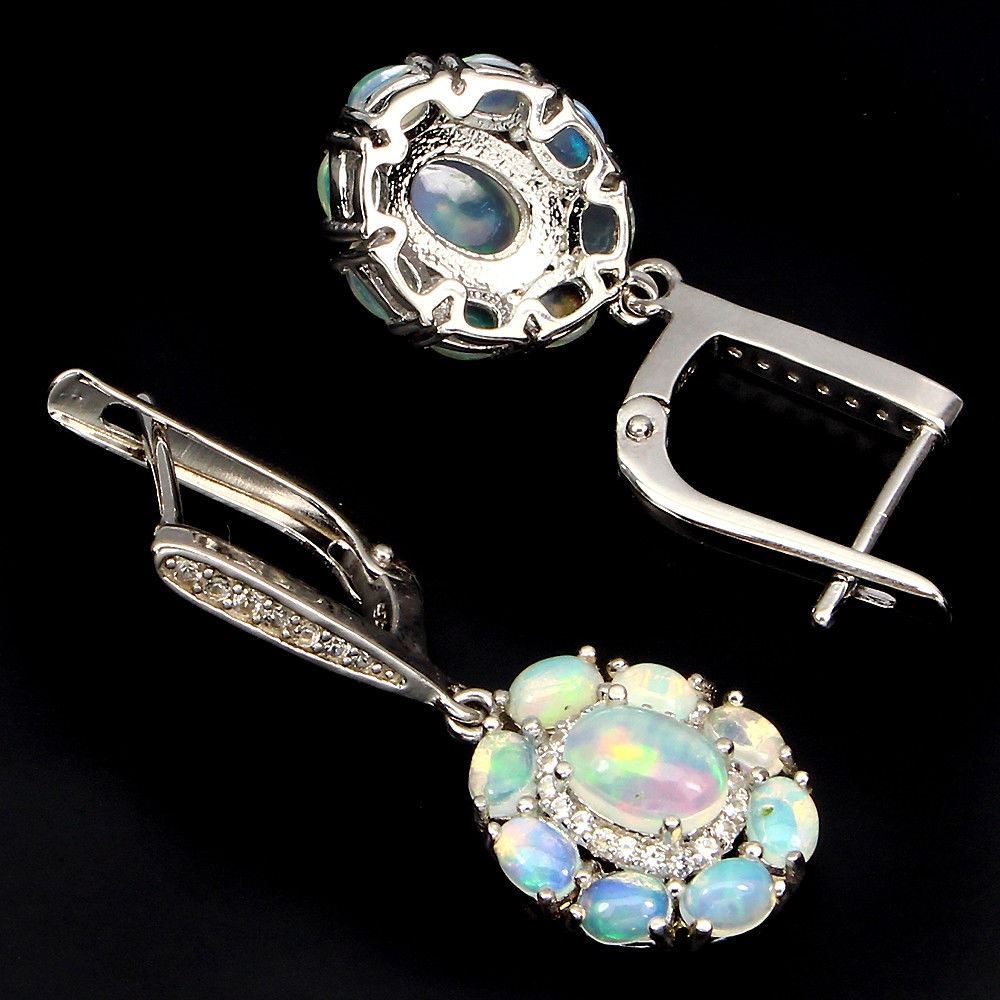 925 STERLING SILVER; PLATE -14K WHITE GOLD; MAIN STONE -FIRE OPAL; OTHER GEMS -CUBIC ZIRCONIA; TOTAL WEIGHT -27.44 CT (TOTAL WEIGHT OF SILVER + STONE) DIMENSION * STONE 4.0 X 3.0 TO 7.0 X 5.0 MM. * CZ 1.0 MM. * FACE EARRINGS 31.0 X 13.0 MM.; MAIN STONE SHAPE -OVAL CABOCHON; MAIN STONE COLOR -BRIGHT YELLOW WITH HOT RAINBOW LUSTER; C TREATMENT -UNHEATED; ORIGIN -ETHIOPIA;