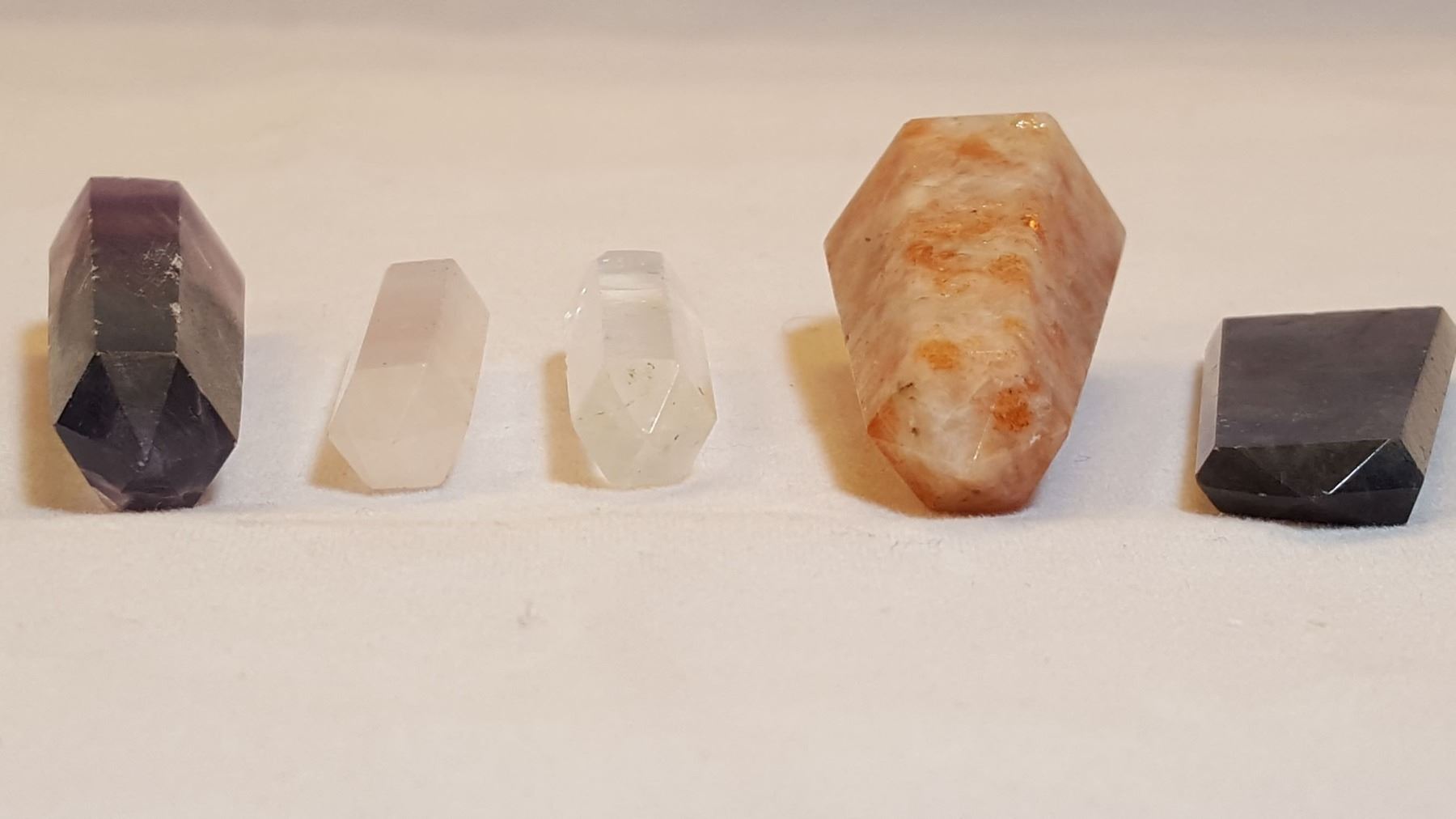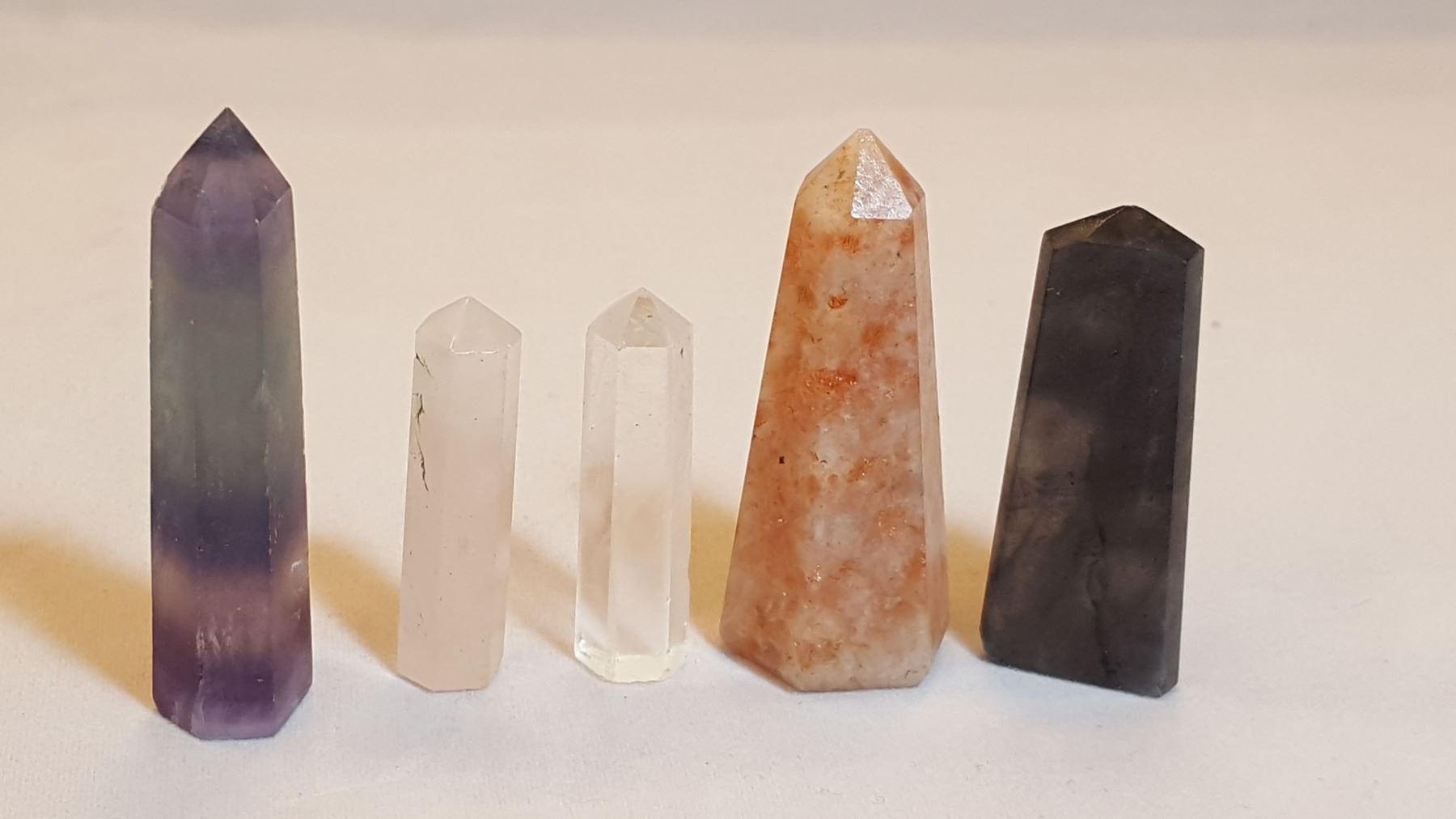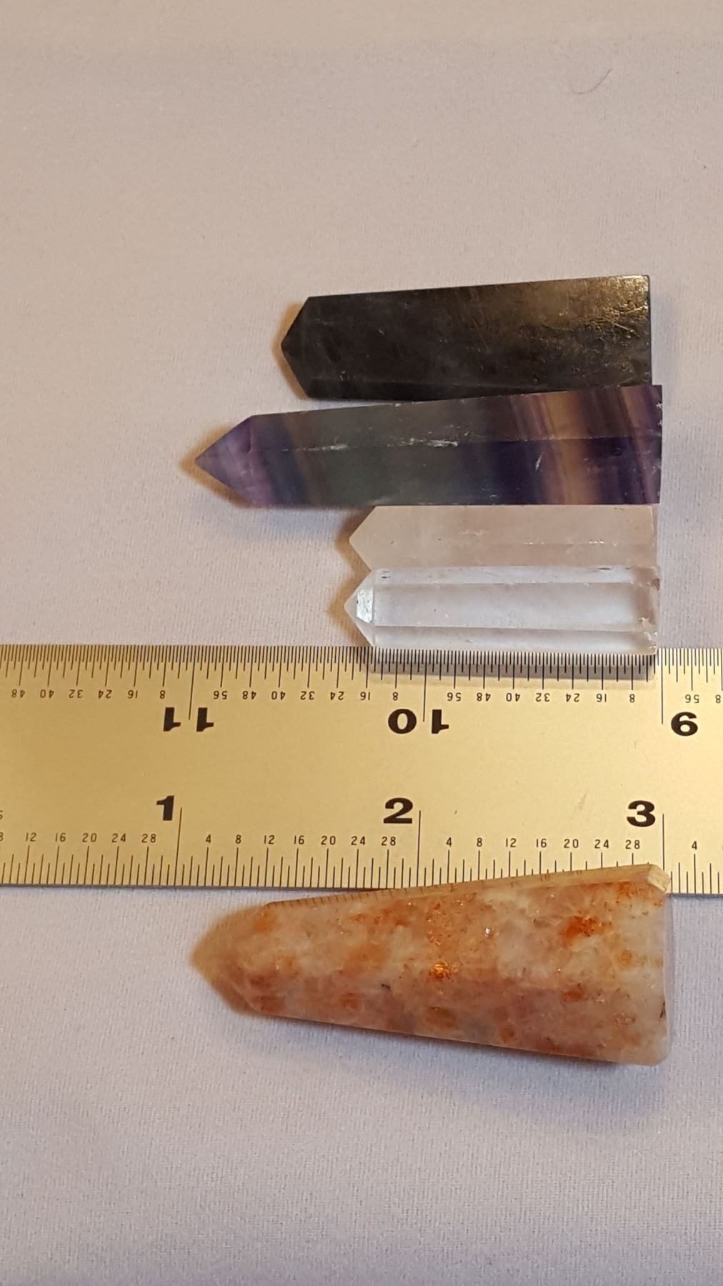 Natural five piece 6 point healing gem lot. Total weight is about 51 grams. Includes muliti color flourite, jasper, and two clear crystal quartz points. These healing wand points have a flat bottom cut so can be self standing.
