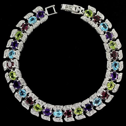 NATURAL RHODOLITE GARNET AMETHYST TOPAZ & CZ STERLING 925 SILVER BRACELET 7.5; STONE SHAPE- OVAL PORTGUESE CUT;STONE DIMENSION5 X 4 MM.;MAIN STONE WEIGHT-12.63 CARAT;COLORMULTI COLOR;CLARITYIF - VVS;LUSTERDAZZLING;TREATMENT- UNHEATED & IRRDIATION;ORIGIN OF STONEAFRICA, ASIA & BRAZIL;HARDNESS6.5 - 8.0;OTHERWHITE CUBIC ZIRCONIA 1.5 MM. ;TOTAL 23.04 Grams