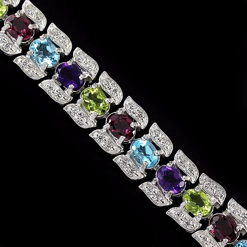 NATURAL RHODOLITE GARNET AMETHYST TOPAZ & CZ STERLING 925 SILVER BRACELET 7.5; STONE SHAPE- OVAL PORTGUESE CUT;STONE DIMENSION5 X 4 MM.;MAIN STONE WEIGHT-12.63 CARAT;COLORMULTI COLOR;CLARITYIF - VVS;LUSTERDAZZLING;TREATMENT- UNHEATED & IRRDIATION;ORIGIN OF STONEAFRICA, ASIA & BRAZIL;HARDNESS6.5 - 8.0;OTHERWHITE CUBIC ZIRCONIA 1.5 MM. ;TOTAL 23.04 Grams