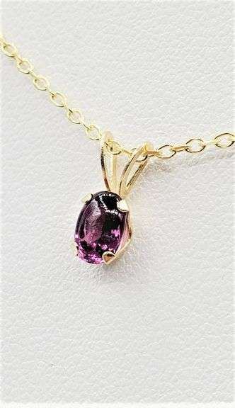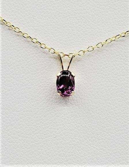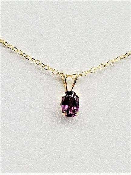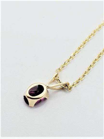 14 kt. yellow gold 6mm x 4mm natural grape garnet pendant with sterling silver chain.