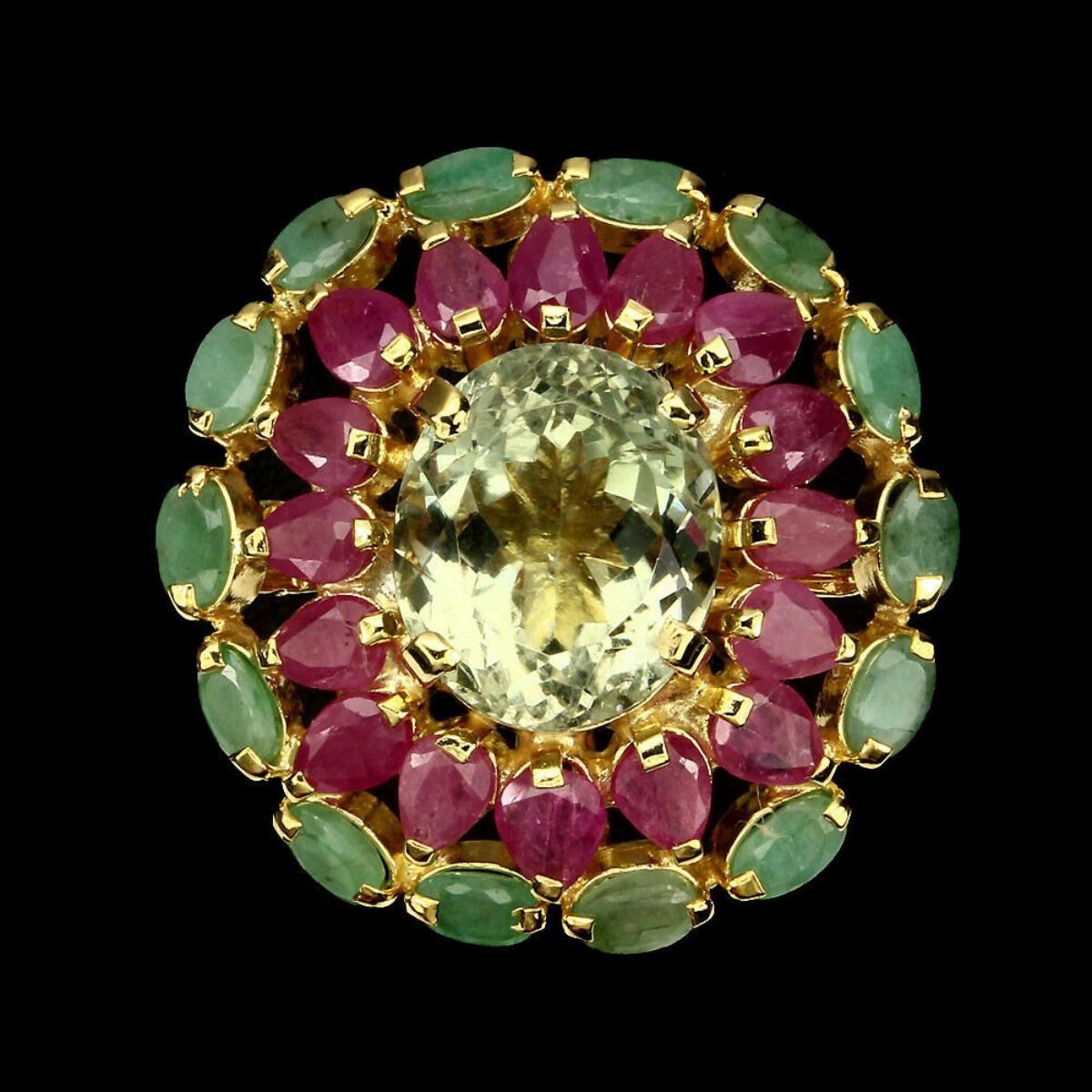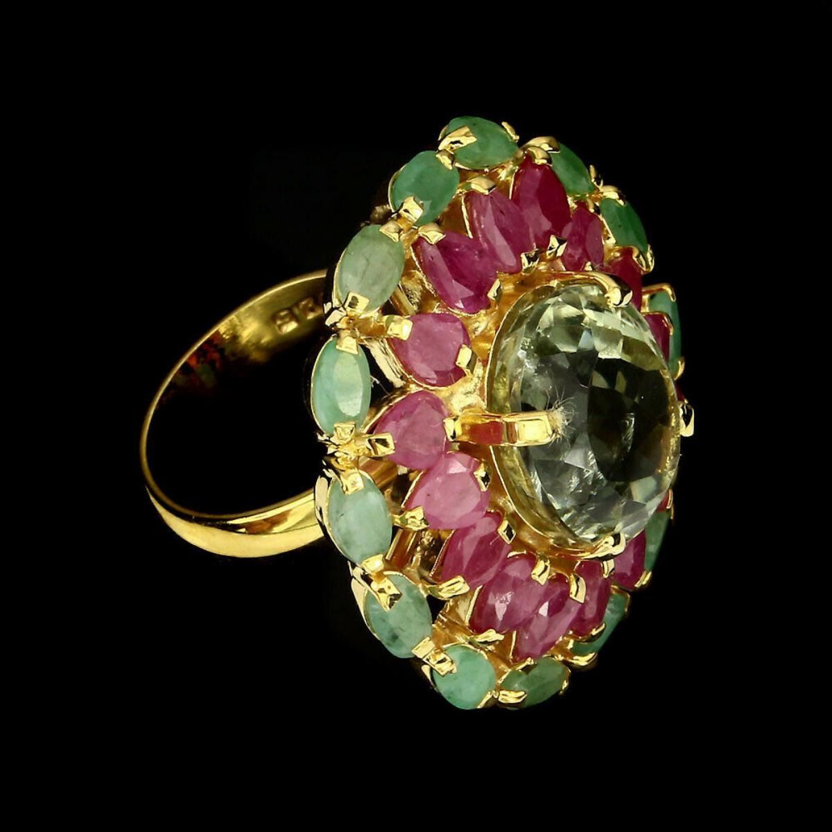 925 STERLING SILVER;PLATE...14K YELLOW GOLD;RING SIZE/LENGTH (INCHES)7.5(can be resized)MAIN STONE...GREEN AMETHYST;OTHER GEMS.....EMERALD,RUBY;TOTAL WEIGHT75.02 CT (TOTAL WEIGHT OF SILVER + STONE)DIMENSION* STONE 5.0 X 3.0 TO 15.0 X 11.0 MM. * RING SIZE 7.5 * FACE RING 32.0 X 31.0 MM.MAIN STONE SHAPE-OVAL CUT;MAIN STONE COLOR-TOP NICE GREEN;ORIGINBRAZIL;HARDNESS7