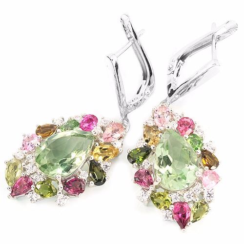NATURAL GREEN AMETHYST, TOURMALINE  CZ 925SILVER EARRING 14K WHITE GOLD COATING; STONE SHAPE -PEAR PORTUGUESE CUT; STONE DIMENSION -12 X 8 MM.; ITEM WEIGHT -8.9 GRAM; COLOR -GREEN; CLARITY -IF - VVS; LUSTER -DAZZLING; TREATMENT -UNHEATED; ORIGIN OF STONE -BRAZIL; HARDNESS -7.0; FACE OF EARRING -41 X 16 MM. ; TOURMALINE -5 X 3 MM. , 4 X 3 MM.; WHITE CUBIC ZIRCONIA -1.7 MM.  1.5 MM.