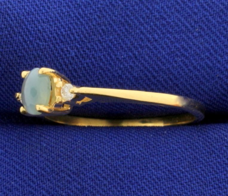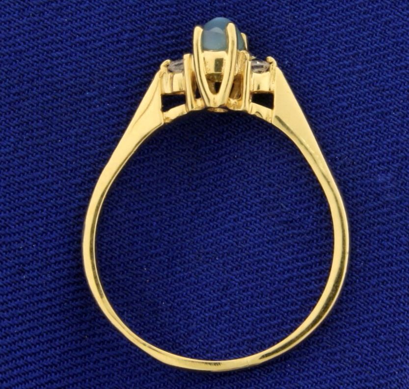 In 18k yellow gold. Contains a high quality 5.5x3.75mm natural green chrysoberyl cats eye gemstone with distinct "eye" and beautiful soft green color. Also contains two high quality .03ct diamonds of SI clarity/F color. Size 9. 2.5g.
