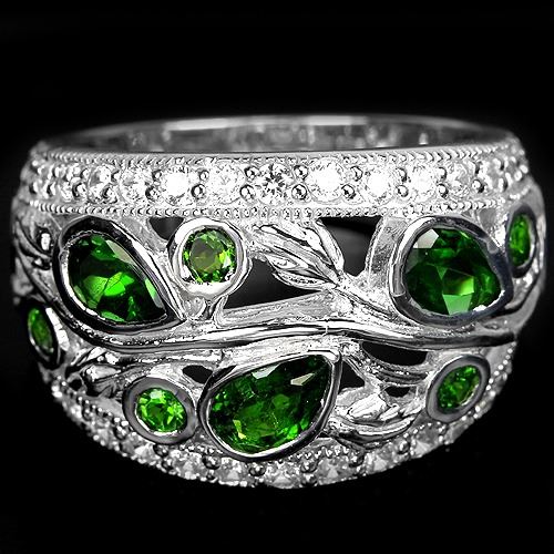 925 Sterling silver.... ring size 7.75; STONE SHAPE- PEAR & ROUND PORTUGESE CUT;STONE DIMENSION6 X 4 MM. , 4 MM. & 2.2 MM.;COLORGREEN;CLARITYIF - VVS;LUSTERDAZZLING;TREATMENT- UNHEATED;ORIGIN OF STONERUSSIAHARDNESS5.0OTHERFACE OF RING 22 X 15 MM. TOTAL weight 7.0 Grams