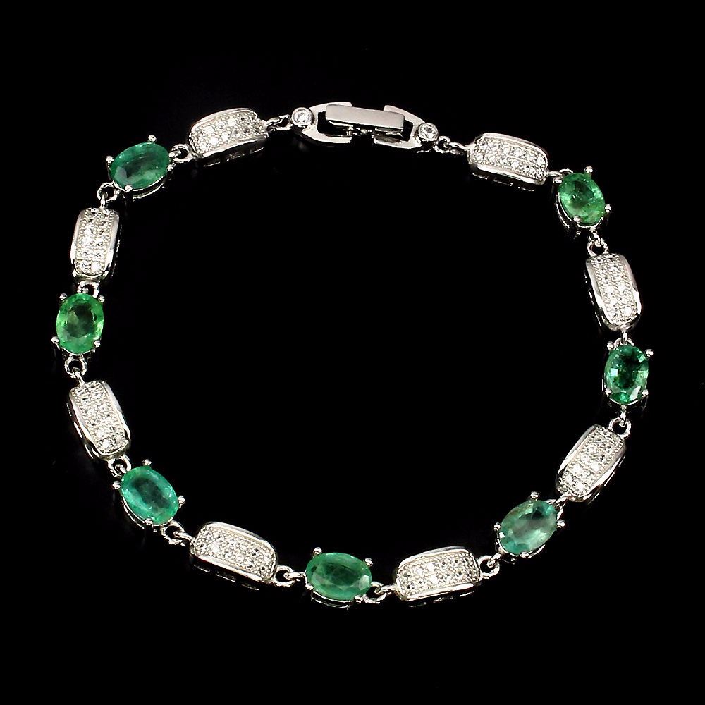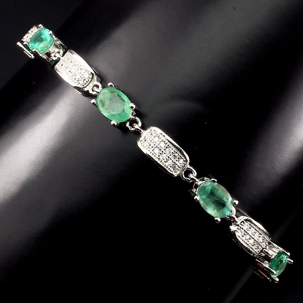 925 STERLING SILVER;PLATE-14K WHITE GOLD;LENGTH (INCHES)-7.5;MAIN STONE-EMERALD;OTHER GEMS-CUBIC ZIRCONIA;TOTAL WEIGHT-59.60 CT (TOTAL WEIGHT OF SILVER + STONE)DIMENSION* STONE 7.0 X 5.0 MM. * CZ 1.0 TO 2.5 MM. * FACE BRACELET 170.0 X 5.0 MM.;MAIN STONE SHAPE-OVAL CUT;MAIN STONE COLOR-TOP RICH GREEN;LUSTER-PRECIOUS;TREATMENT-UNHEATED;ORIGIN-BRAZIL;HARDNESS-7.5 - 8.0