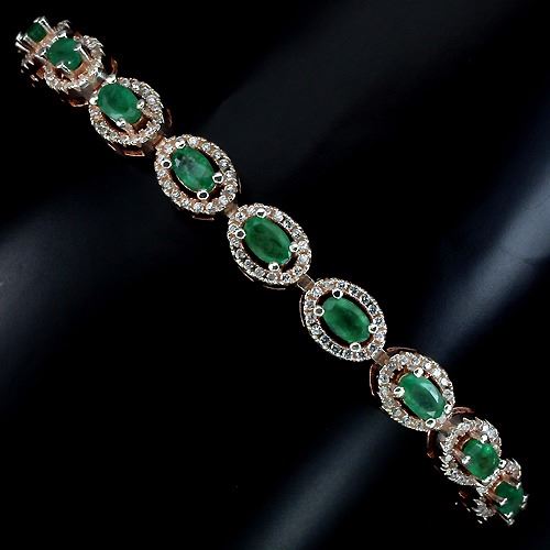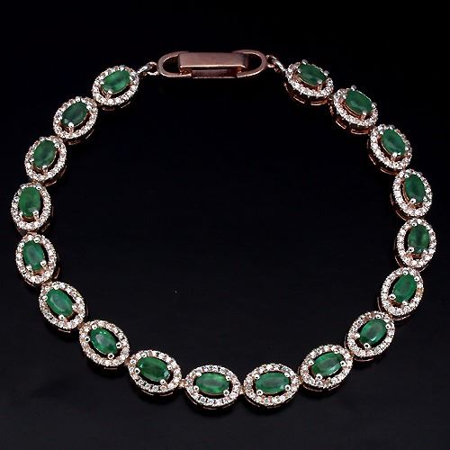 EMERALD (NATURAL) & CUBIC ZIRCONIA 14K ROSE GOLD PLATED 925 SILVER BRACELET;WEIGHT (CT.):75.77 CT. (total weight of silver + stone)DIMENSION:* STONE 5.0 X 3.0 MM. * CZ 1.0 MM.* LENGTH 7.5 INCHES. * FACE BRACELET 165.0 X 6.0 MM.SHAPE/CUT:OVAL FACET & ROUND DIAMOND CUTCOLOR:TOP RICH GREEN & AAA WHITECLARITY/GRADE:TRANSPARENT & IF TO VVS.....LUSTER:MESMERIZING....TREATMENT:UNtreated; ORIGIN:BRAZIL; HARDNESS:7.5 - 8.0