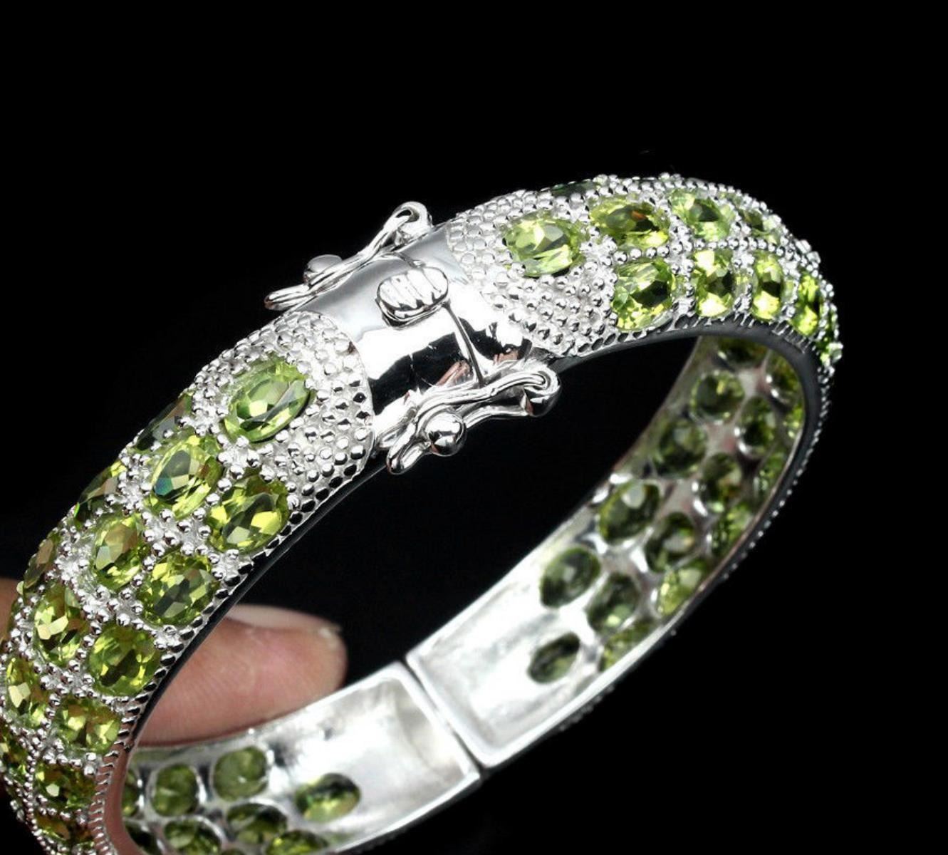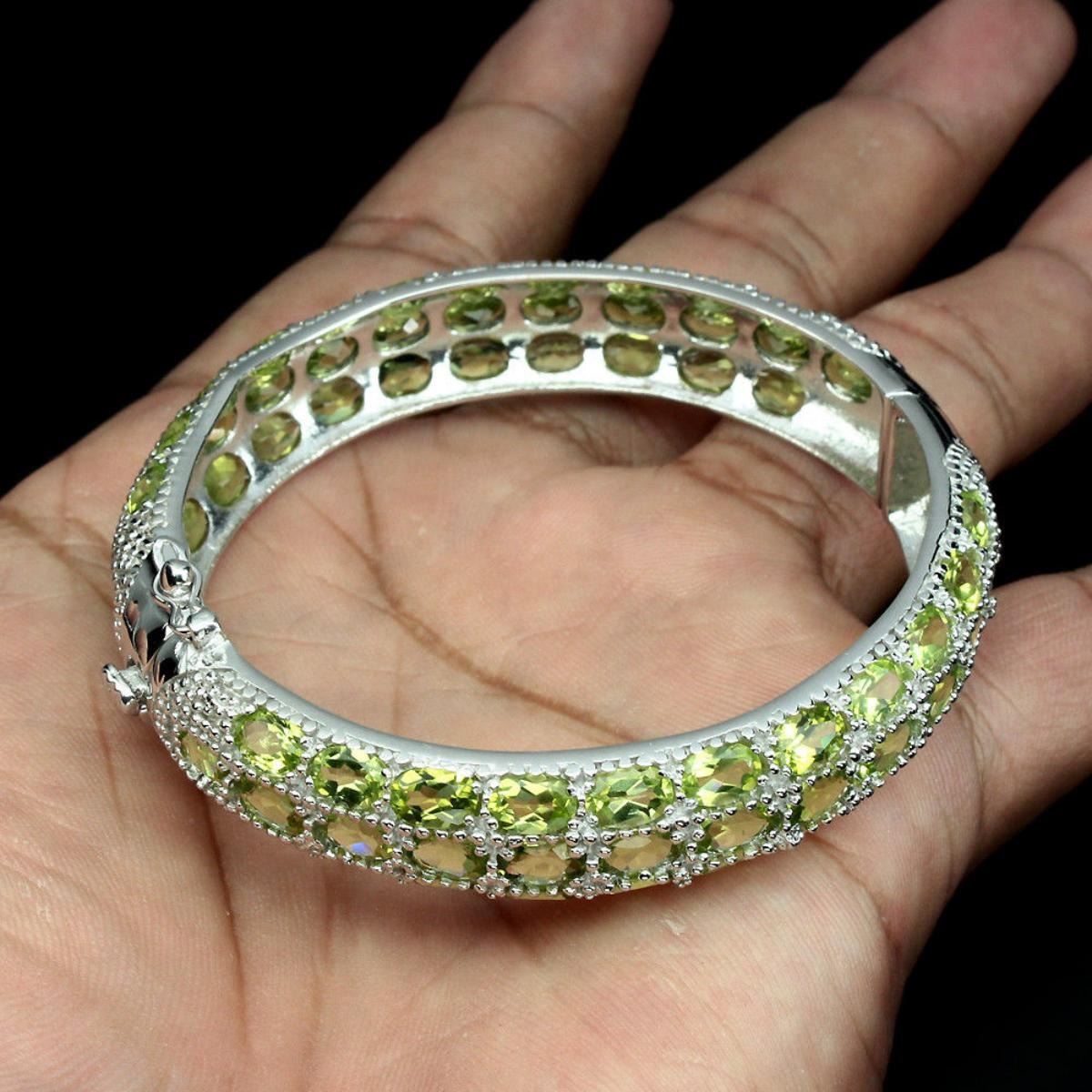 925 STERLING SILVER; PLATE .....14K WHITE GOLD; LENGTH (INCHES) 2.1; MAIN STONE PERIDOT TOTAL WEIGHT 156.80 CT (TOTAL WEIGHT OF SILVER + STONE) DIMENSION * STONE 7.0 X 5.0 MM. * DIAMETER 2.1 INCHES. * FACE BANGLE 66.0 X 12.0 MM. MAIN STONE SHAPE OVAL CUT MAIN STONE COLOR TOP RICH GREEN CLARITY/GRADE IF TO VVS LUSTER GRACEFULLY TREATMENT UNHEATED ORIGIN PAKISTAN HARDNESS 6.5 - 7.0