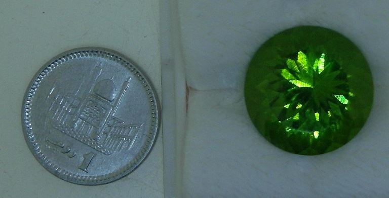 Natural Green Peridot 20 carats - no Treatment in any way; round brilliant cut; almost eye clean; origin - Pakistan; there is 35 carats and 53 carats cushion cut peridots available from same lot....please contact us if you are interested in bigger single stone peridots from same lot.