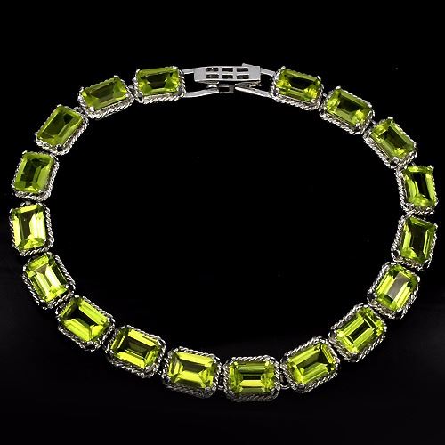 PERIDOT (NATURAL) 14K WHITE GOLD COATING 925 SILVER BRACELETUNIT OF ITEM (S):1 PIECEWEIGHT (CT.):77.21 CT. (total weight of silver + stone)DIMENSION:* STONE 7.0 X 5.0 MM. * LENGTH 7.0 INCHES. * FACE BRACELET 165.0 X 7.0 MM.SHAPE/CUT:OCTAGON FACETCOLOR:TOP RICH GREENCLARITY/GRADE:IF TO VVSLUSTER:GORGEOUSTREATMENT:UNHEATEDORIGIN:PAKISTANHARDNESS:6.5 - 7.0