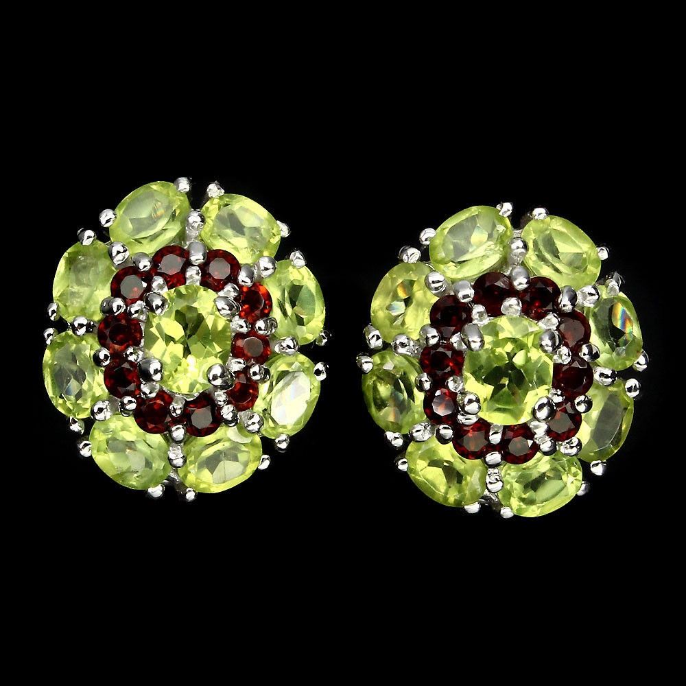 925 STERLING SILVER; PLATE -14K WHITE GOLD; MAIN STONE -PERIDOT; OTHER GEMS -MOZAMBIQUE GARNET; TOTAL WEIGHT -30.59 CT (TOTAL WEIGHT OF SILVER + STONE) DIMENSION * STONE 2.0 TO 5.0 X 4.0 MM. * FACE EARRINGS 15.0 X 14.0 MM.; MAIN STONE SHAPE -OVAL CUT; MAIN STONE COLOR -TOP RICH GREEN; CLARITY/GRADE -IF TO VVS; TREATMENT -UNHEATED; ORIGIN -PAKISTAN; HARDNESS -6.5 - 7.0