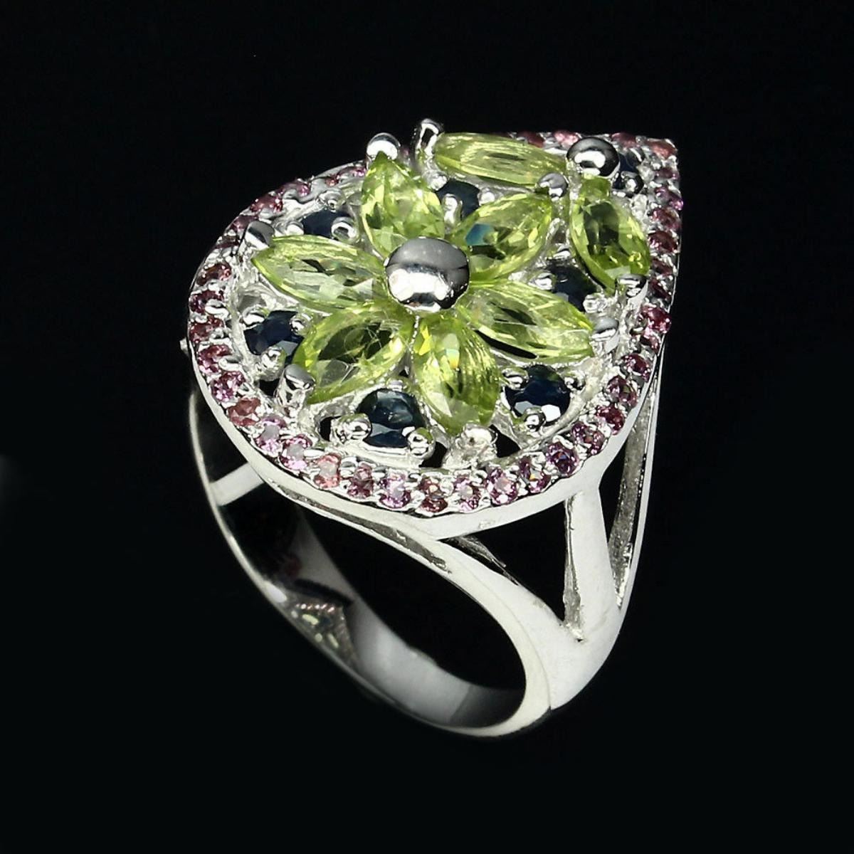 925 STERLING SILVER;PLATE14K WHITE GOLD;RING SIZE (resizeable)8;MAIN STONEPERIDOTOTHER GEMSRHODOLITE GARNET,SAPPHIRETOTAL WEIGHT34.82 CT (TOTAL WEIGHT OF SILVER + STONE)DIMENSION* STONE 1.0 TO 6.0 X 3.0 MM. * FACE RING 24.0 X 18.0 MM.MAIN STONE SHAPEMARQUISE CUTMAIN STONE COLORTOP RICH GREENCLARITY/GRADEIF TO VVSLUSTERELEGANTTREATMENTUNHEATEDORIGINPAKISTANHARDNESS6.5 - 9.0