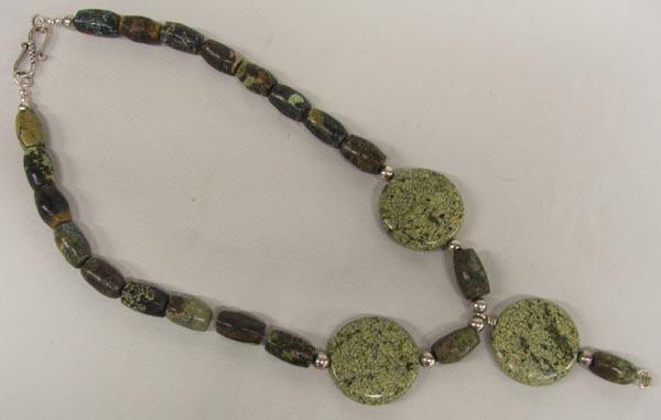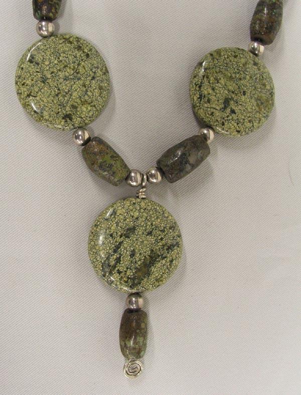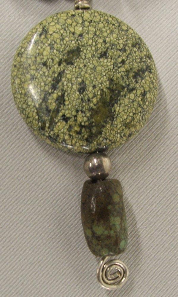 Natural Green Stone and Sterling Necklace, measures 18'' end to end and pendant measures 2.25''. SHI $15.