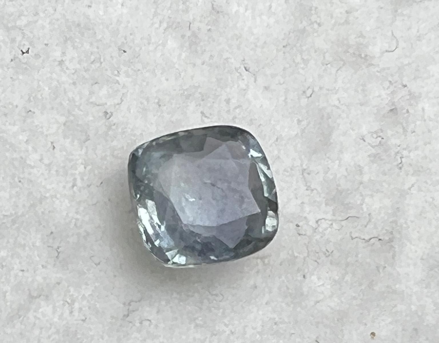 Natural Greyish Blue Ceylon Sapphire; Weight- 2.185 Cts.; Size- 7.43x7.15 MM; Shape- Cushion; Color - Greyish Blue; Clarity - SI; Origin- Ceylon; Untreated....natural earth mined.