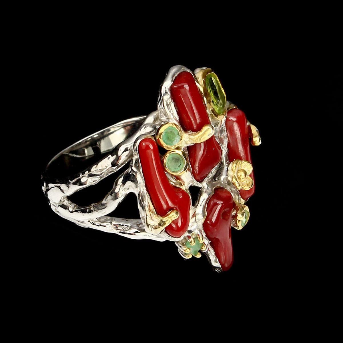 925 STERLING SILVERPLATE2-TONE WHITE & YELLOW 14K GOLDRING SIZE/LENGTH (INCHES)8.5(can be resized)MAIN STONECORALOTHER GEMSEMERALD,PERIDOTTOTAL WEIGHT46.99 CT (TOTAL WEIGHT OF SILVER + STONE)DIMENSION* STONE 2.0 TO 12.0 X 5.0 MM. * RING SIZE 8.5 * FACE RING 23.0 X 19.0 MM.MAIN STONE SHAPENATURAL SHAPEMAIN STONE COLORTOP RICH REDCLARITY/GRADEOPAQUELUSTERGORGEOUSTREATMENTUNHEATEDORIGINCROATIAHARDNESS3.0
