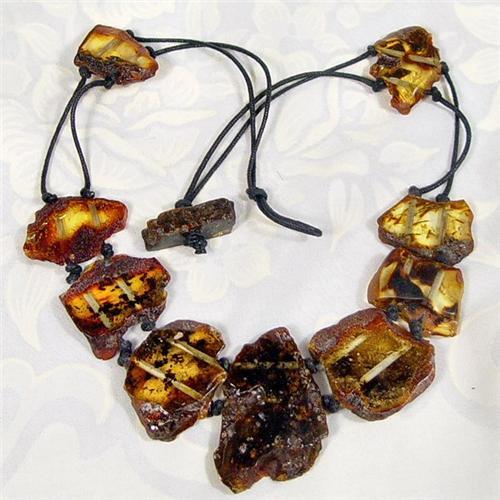 Natural Handknotted Baltic Amber Choker... A remarkable necklace of multicolored Baltic amber plates with an adjustable length up to a maximum of 17". The center amber has measurements of 44x28mm. For those not familiar with metric 25mm=1". Gram weight is 26 and if you adore a more rugged presentation this piece of jewelry is worthy of consideration.