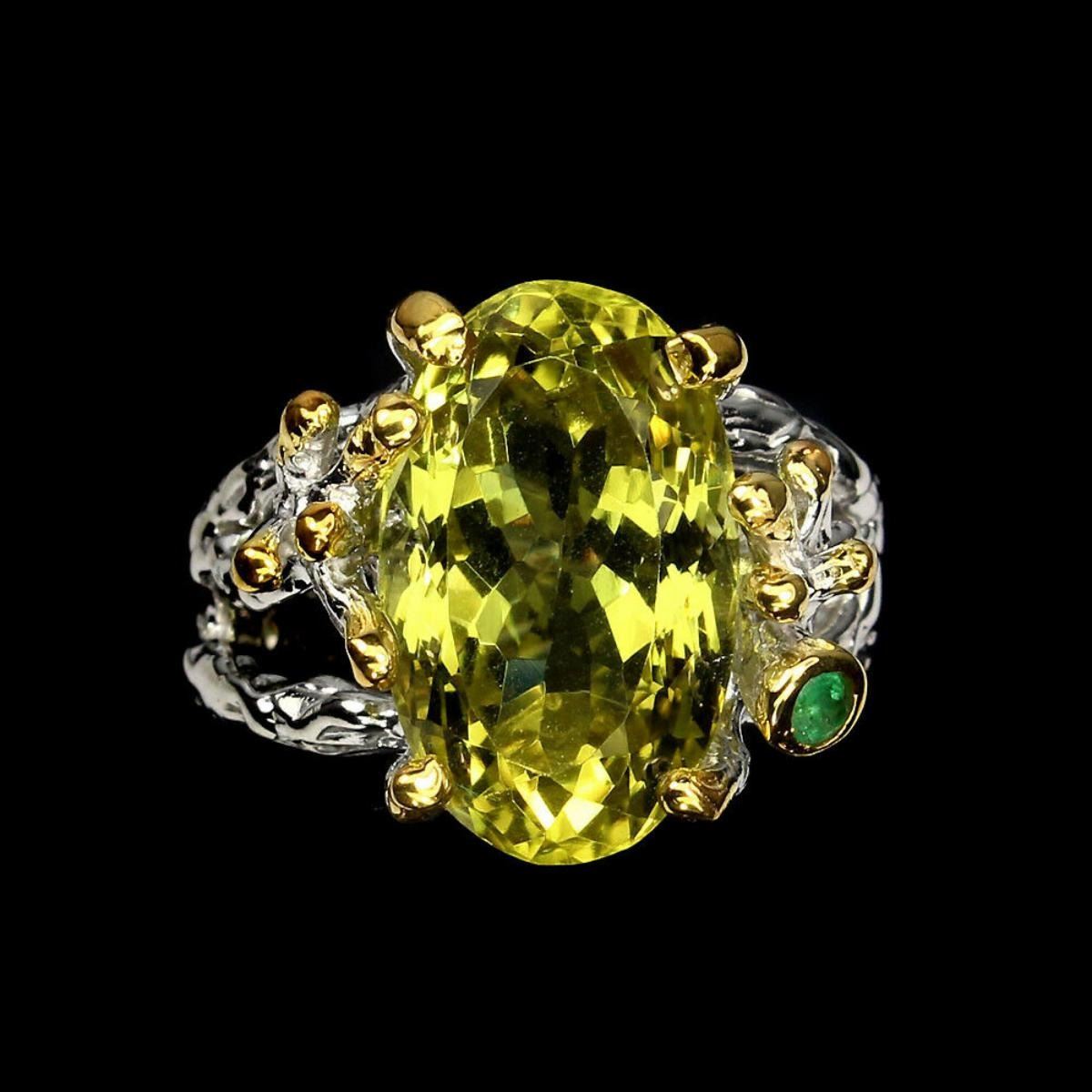 925 STERLING SILVER;PLATE--2-TONE WHITE & YELLOW 14K GOLD;RING SIZE-8(resizeable)MAIN STONE-LEMON QUARTZ;OTHER GEMS-EMERALD;TOTAL WEIGHT-43.00 CT (TOTAL WEIGHT OF SILVER + STONE)DIMENSION* STONE 2.5 TO 17.0 X 10.0 MM. * FACE RING 19.0 X 17.0 MM.MAIN STONE SHAPE-OVAL CUT;MAIN STONE COLOR-TOP LEMON YELLOW;CLARITY/GRADEIF;LUSTERGORGEOUS;TREATMENTUNHEATED;ORIGINBRAZIL;HARDNESS7.0 - 8.0;