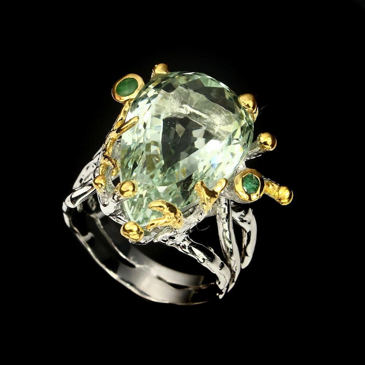 925 STERLING SILVER;PLATE-2-TONE WHITE & YELLOW 14K GOLD;RING SIZE-7.5 (resizeable)MAIN STONE-AMETHYST;OTHER GEMS-EMERALD;TOTAL WEIGHT-48.42 CT (TOTAL WEIGHT OF SILVER + STONE)DIMENSION* STONE 2.5 TO 21.0 X 13.0 MM. * RING SIZE 7.5 * FACE RING 22.0 MM.;MAIN STONE SHAPE-PEAR CUT;MAIN STONE COLOR-TOP NICE GREEN;CLARITY/GRADE-IF;TREATMENT-HEATED;ORIGIN-BRAZIL;HARDNESS-7.0 - 8.0;