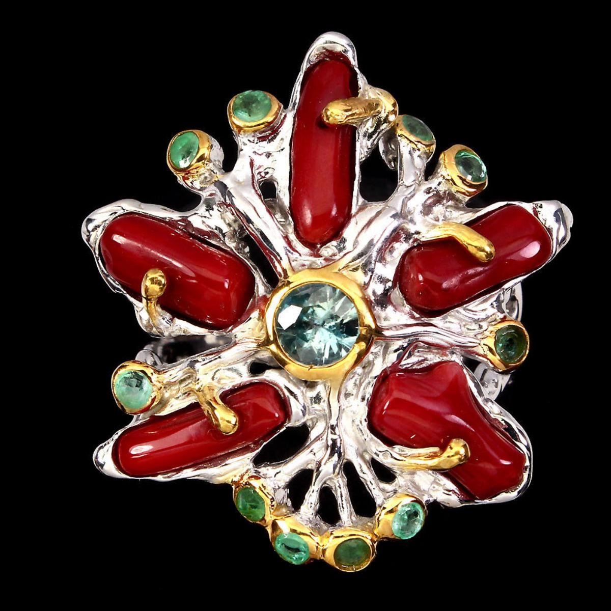 925 STERLING SILVER;PLATE2-TONE WHITE & YELLOW 14K GOLD;RING SIZE(resizeable)9;MAIN STONECORALOTHER GEMSEMERALD,ZIRCONTOTAL WEIGHT45.90 CT (TOTAL WEIGHT OF SILVER + STONE)DIMENSION* STONE 4.0 TO 12.0 X 3.0 MM. * RING SIZE 9.0 * FACE RING 29.0 X 26.0 MM.MAIN STONE SHAPEROUGH NATURALMAIN STONE COLORTOP REDCLARITY/GRADEOPAQUELUSTERGORGEOUSTREATMENTUNHEATEDORIGINCROATIAHARDNESS3.0 - 8.0