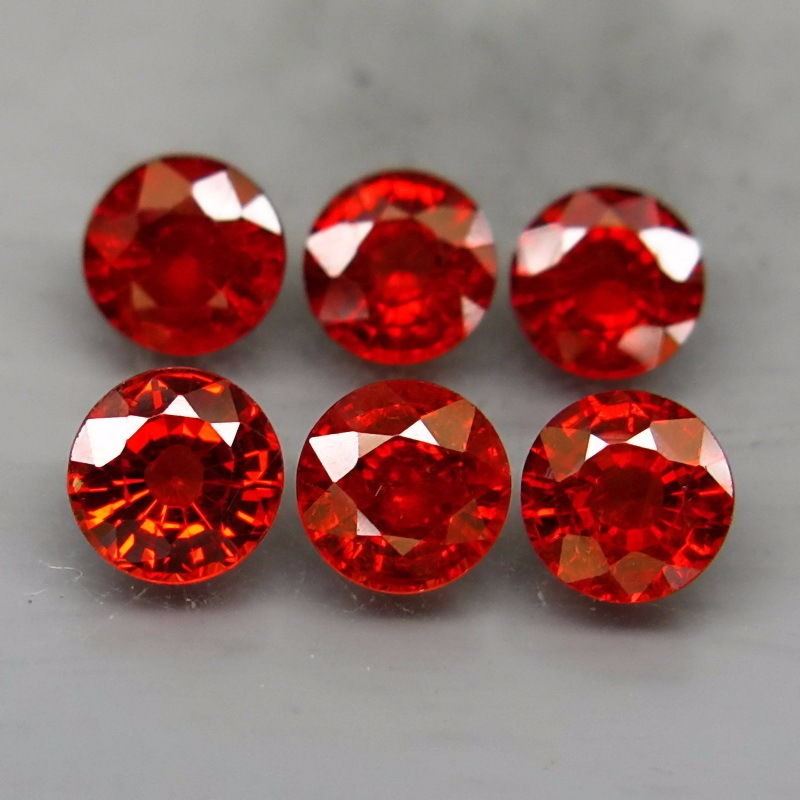 Garnet Spessartine....SHAPE :Round;WEIGHT :4.80 Ct.;SIZE :5.5 Mm.;QUANTITY :6 Pieces;COLOR :Best Orange Red;CLARITY :I1-i2;LUSTER :Superior;ORIGIN :Africa;TREATMENT :None;HARDNESS :7-7.5;