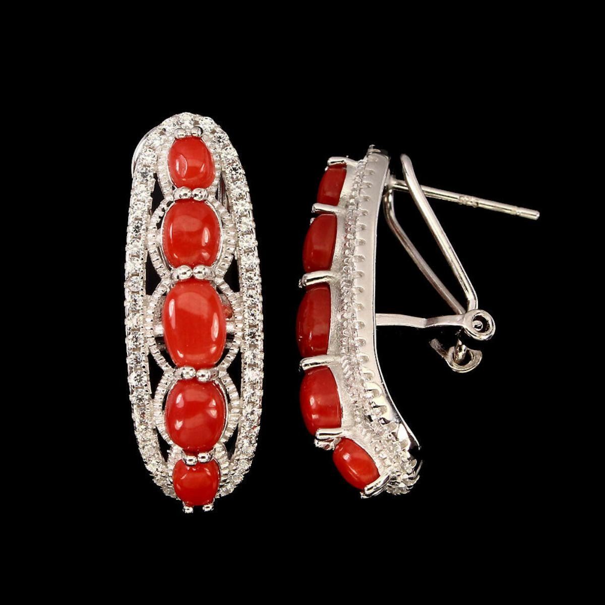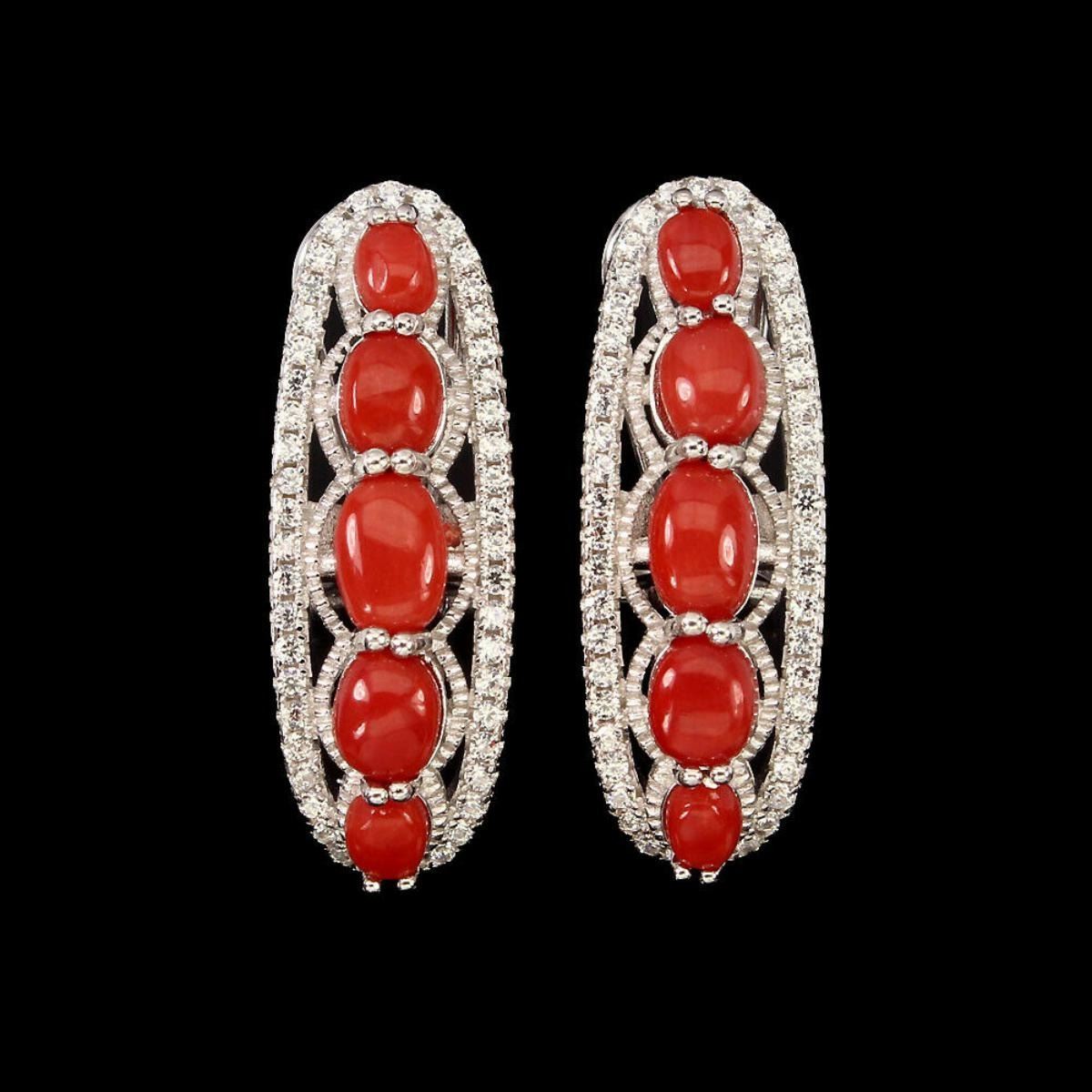 925 STERLING SILVER;PLATE....14K WHITE GOLD;MAIN STONE-CORAL;OTHER GEMS-CUBIC ZIRCONIA;TOTAL WEIGHT-32.48 CT (TOTAL WEIGHT OF SILVER + STONE)DIMENSION* STONE 4.0 X 3.0 TO 6.0 X 4.0 MM. * CZ 1.0 MM. * FACE EARRINGS 26.0 X 9.0 MM.MAIN STONE SHAPE-OVAL CABOCHON;MAIN STONE COLOR-TOP RICH RED;TREATMENT-UNHEATED;ORIGINITALYHARDNESS-3