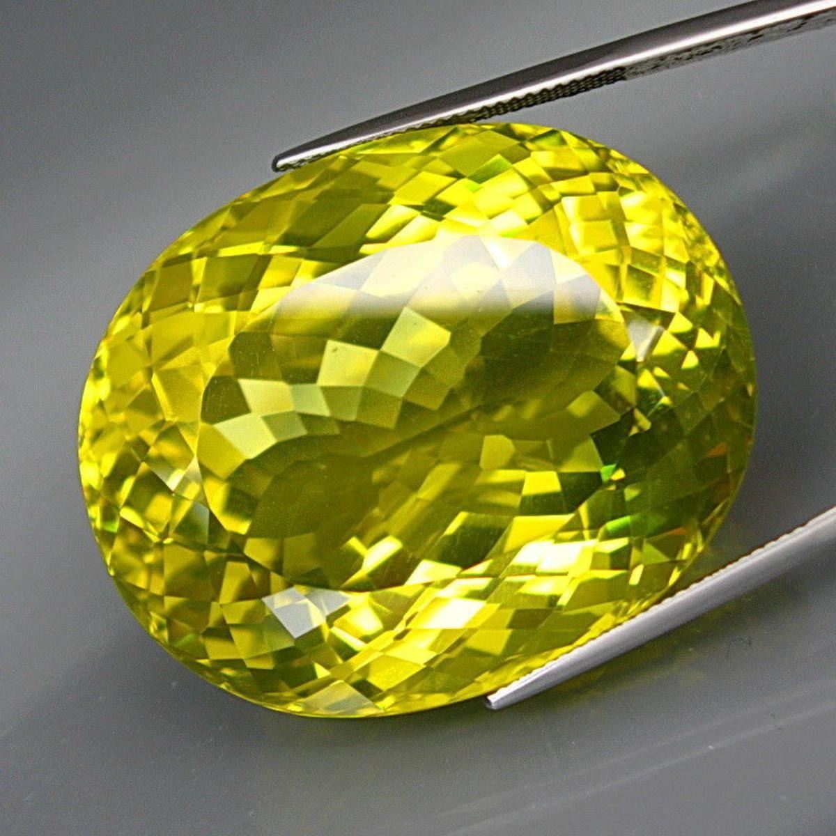 Lemon Quartz SHAPE Oval WEIGHT 85.17 Ct.SIZE 32.1 X 25.9 X 16.7 mm QUANTITY 1 Piece COLOR Lemon Yellow CLARITY VVs/VS; LUSTER Superior ORIGIN Brazil; TREATMENT None HARDNESS 7
