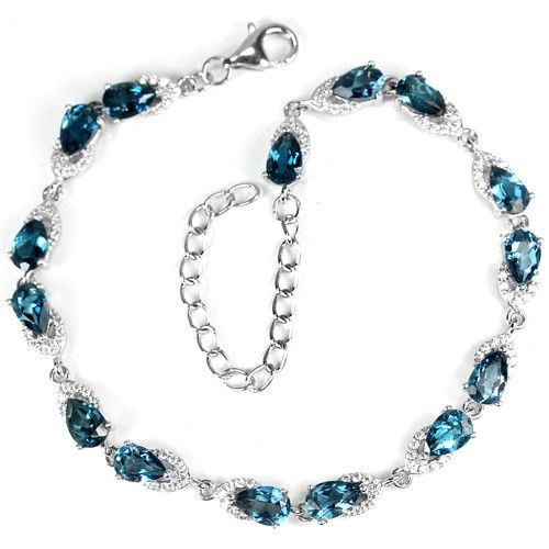 GENUINE AAA LONDON BLUE TOPAZ CZ 925 SILVER BRACELET 14K WHITE GOLD COATING; LENGTH OF ITEM (Inch.) 9.00; ITEM QUANTITY 1 STONE SHAPE PEAR STONE DIMENSION 6 X 4 MM. ITEM WEIGHT 7.41 GRAM COLOR LONDON BLUE CLARITY IF TO VVS LUSTER DAZZLING TREATMENT IRRADIATION ORIGIN OF STONE AFRICA HARDNESS 8 OTHER WHITE CUBIC ZIRCONIA 1 MM.