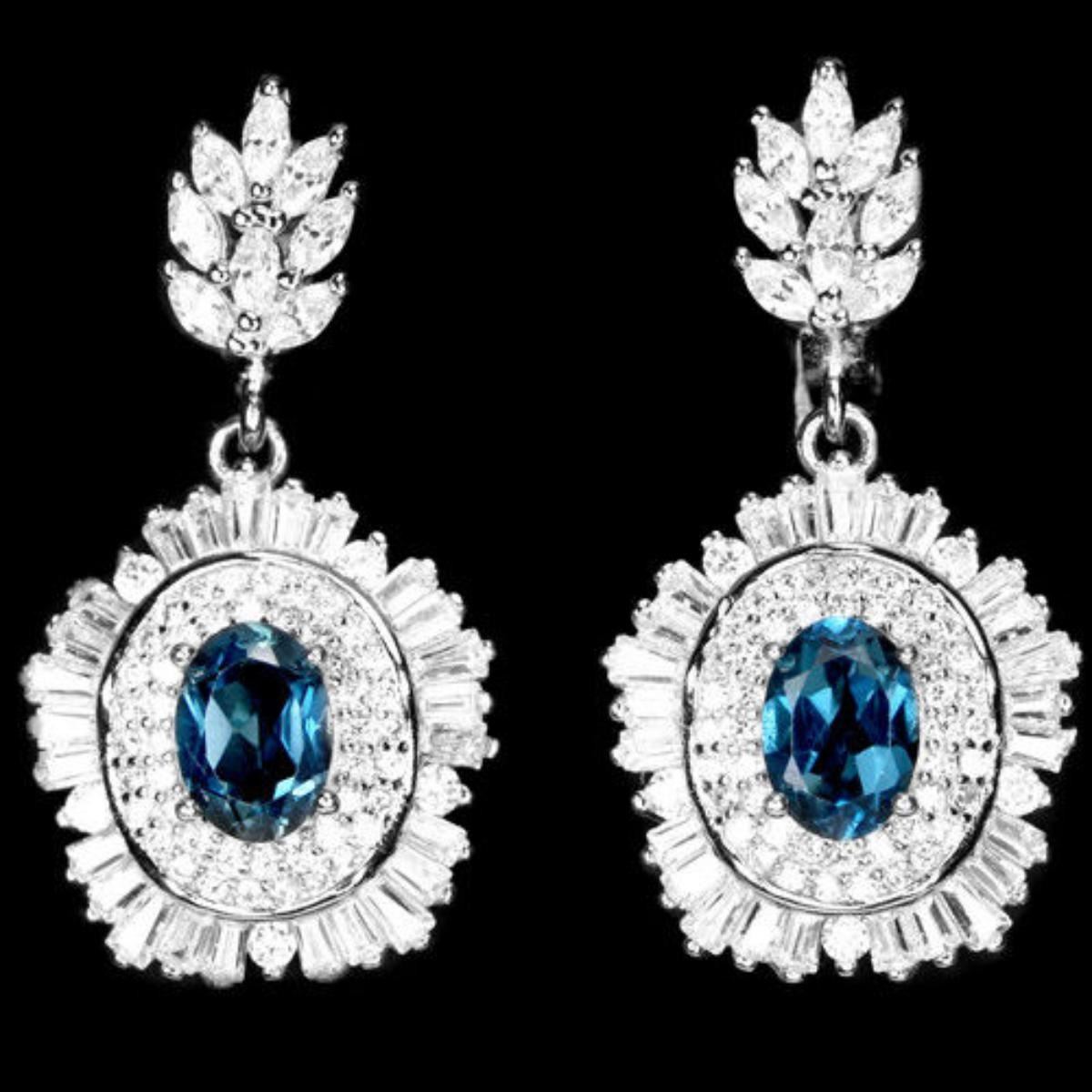 GENUINE LONDON BLUE TOPAZ & WHITE CZ 925 SILVER EARRING 14K WHITE GOLD COATING; STONE SHAPEOVALSTONE DIMENSION7 X 5 MM.ITEM WEIGHT8.3 GRAMCOLORLONDON BLUECLARITYIF - VVSLUSTERALLURINGTREATMENTIRRADIATIONORIGIN OF STONEAFRICAHARDNESS8.0;FACE OF EARRING 29 X 15 MM. WHITE CUBIC ZIRCONIA 3 X 1.5 MM. , 2.5 X 1.5 X 1 MM. , 1.5 MM. , 1.2 MM.