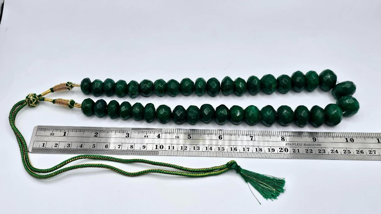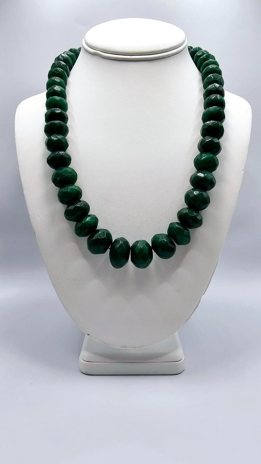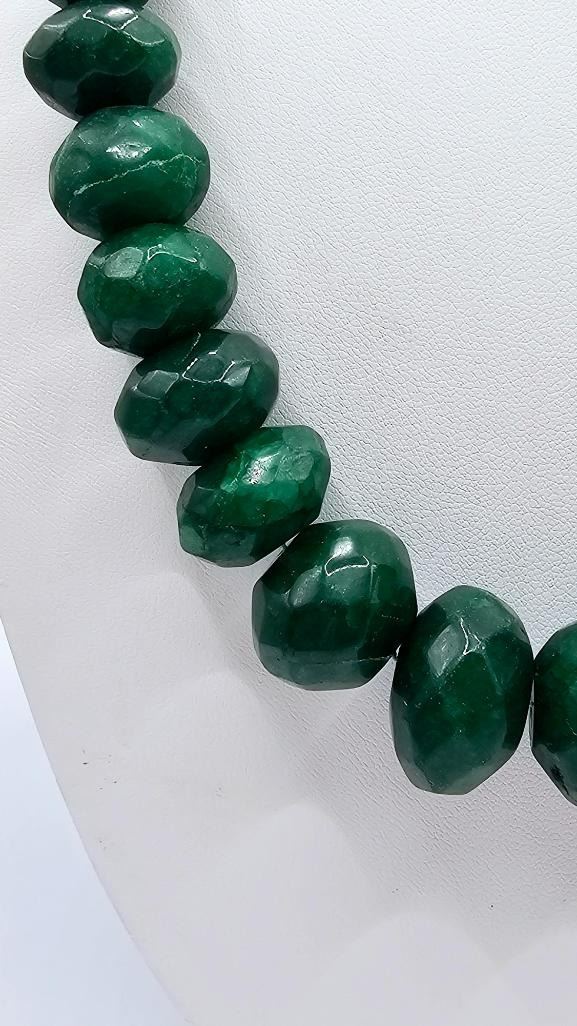 Beautiful Large 881 Cttw Genuine Emerald Necklace. These Natural Mined From The Earth Natural Emerald Faceted Beads Range In Size From Approx. 14 To 18 mm. They are natural opaque faceted oval cuts with a High Polish and Luster. Adjustable Neck Size From As Small As 16 " To 32 " To Go With Almost Any Outfit. Beads treated to enhance color.