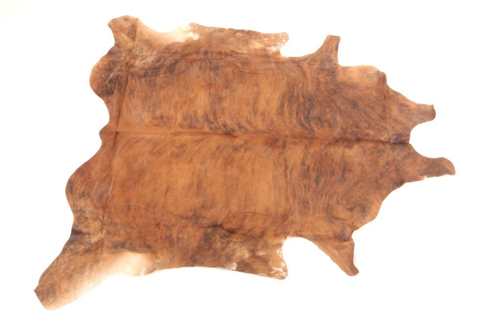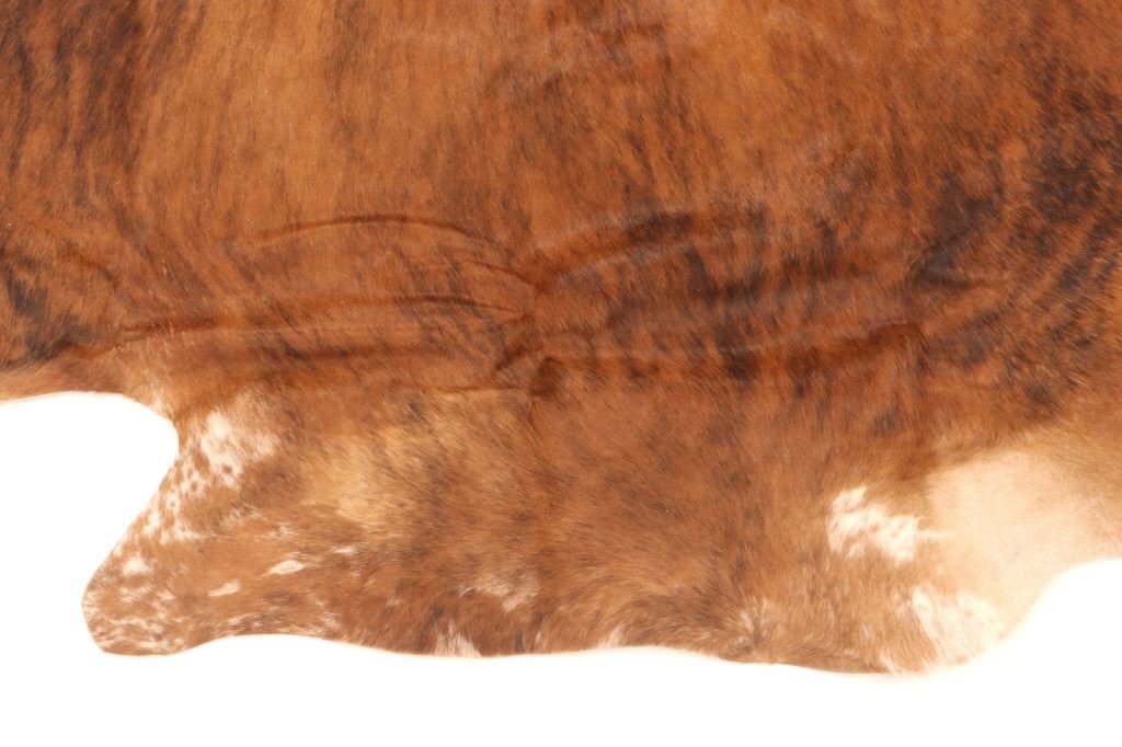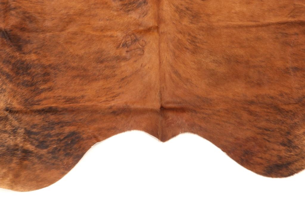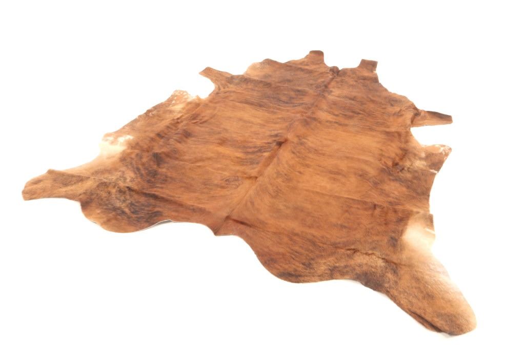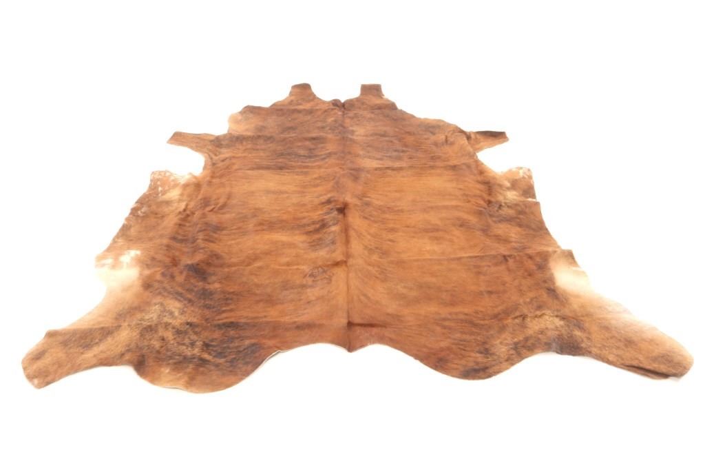 This is an excellent, premium cowhide rug with beautiful brindle, light brown coloring, almost a caramel color, slightly fading into a lighter color towards the front and on the inside part of the legs. The cowhide (also referred to as cow hide, steer hide, steer hide) is a brand-new example that has been professionally tanned; it is in pristine condition. The rug is also considered an Extra-Large (XL) to Extra-Extra-Large (XXL) size, being 7 feet 9 inches long by 6 feet 10 inches wide.