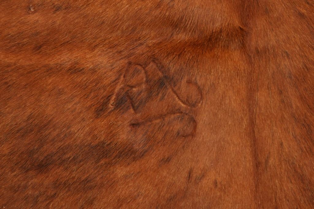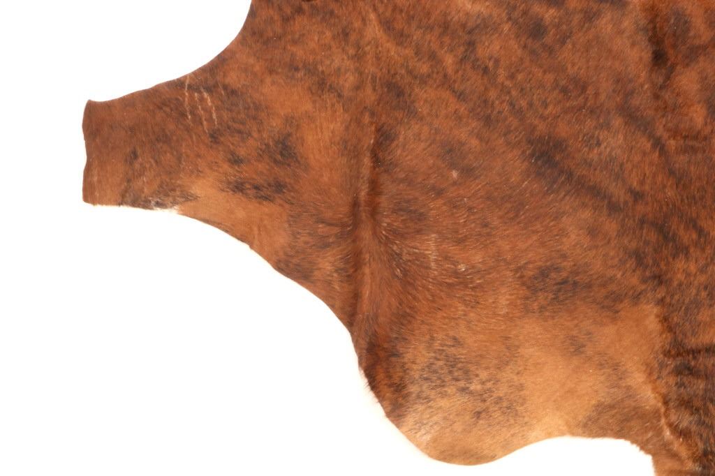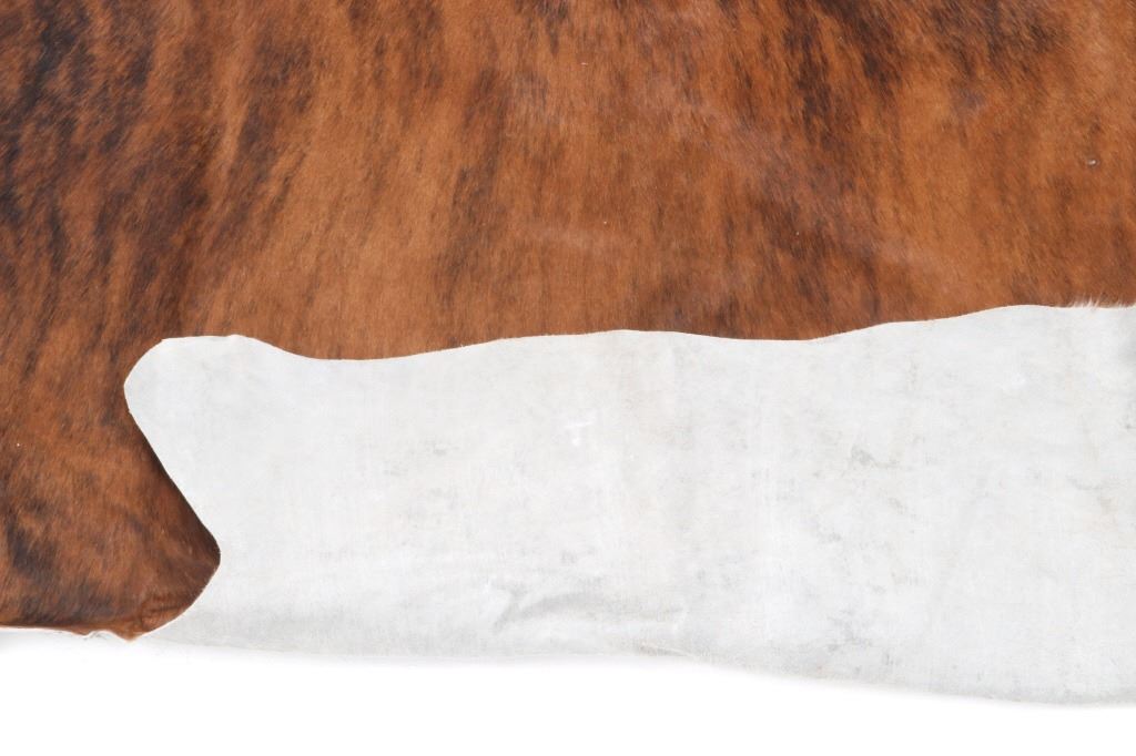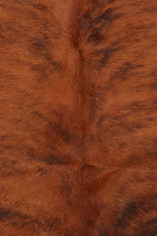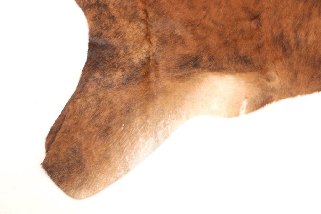 This is an excellent, premium cowhide rug with beautiful brindle, light brown coloring, almost a caramel color, slightly fading into a lighter color towards the front and on the inside part of the legs. The cowhide (also referred to as cow hide, steer hide, steer hide) is a brand-new example that has been professionally tanned; it is in pristine condition. The rug is also considered an Extra-Large (XL) to Extra-Extra-Large (XXL) size, being 7 feet 9 inches long by 6 feet 10 inches wide.