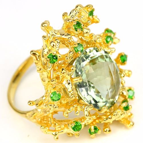NATURAL GREEN AMETHYST & CHROME DIOPSIDE 925 SILVER RING 14K YELLOW GOLD COATING; RING SIZE, LENGTH OF ITEM (Inch.)8.00 ( $10.00 for resize )ITEM QUANTITY1STONE SHAPEOVAL & ROUNDSTONE DIMENSION14.6 X 12 X 7 MM. , 2 MM.ITEM WEIGHT11.2 GRAMCOLORGREENCLARITYIF TO VVSLUSTERGORGEOUSTREATMENTNATURAL UNHEATEDORIGIN OF STONEBRAZIL & RUSSIAHARDNESS5 - 7OTHERFACE OF RING 32 X 25 MM.