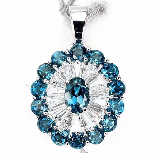 LONDON BLUE TOPAZ (NATURAL) & CUBIC ZIRCONIA 14K WHITE GOLD PLATED 925 SILVER PENDANT...........UNIT OF ITEM (S):1 PIECE;WEIGHT (CT.):17.57 CT. (total weight of silver + stone);DIMENSION:* STONE 3.0 TO 6.0 X 4.0 MM. * CZ 3.5 X 2.0; MM. * FACE PENDANT 25.0 X 16.0 MM.;SHAPE/CUT:OVAL, ROUND FACET & TAPERED BAGUETTE DIAMOND CUT;COLOR:TOP LONDON BLUE & AAA WHITE;CLARITY/GRADE:VVS;LUSTER:GORGEOUS;TREATMENT:HEATED;ORIGIN:AFRICA;HARDNESS:8.0