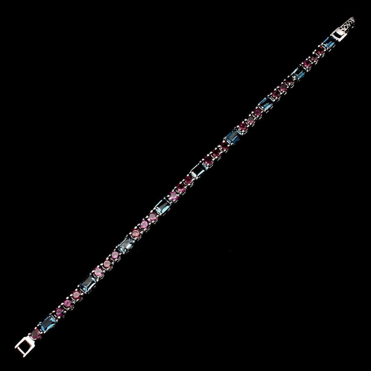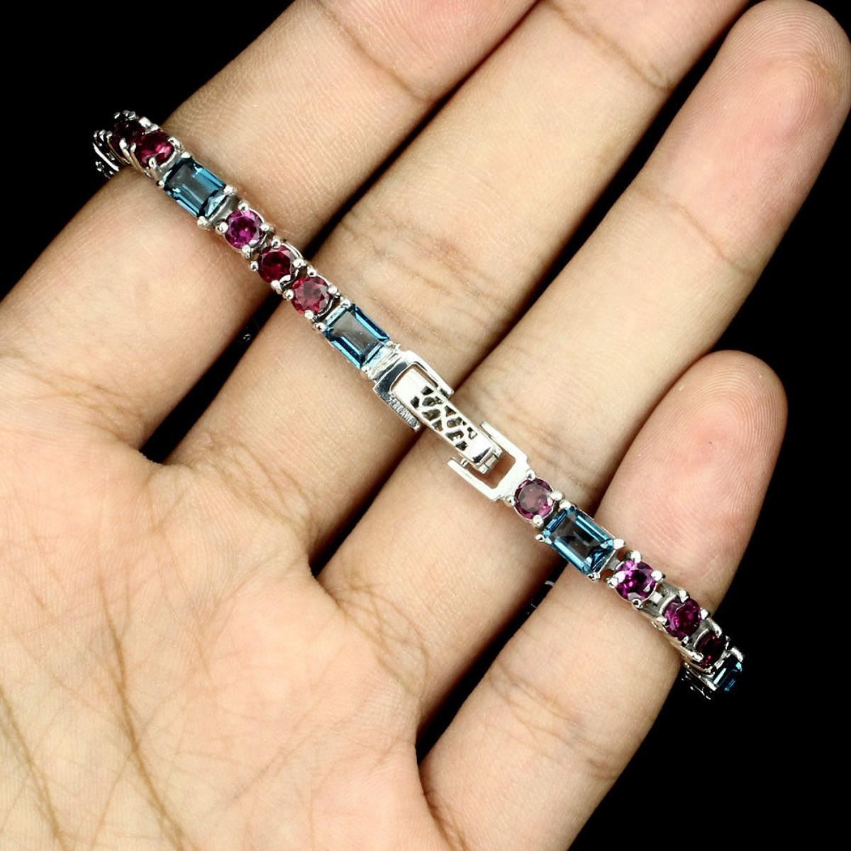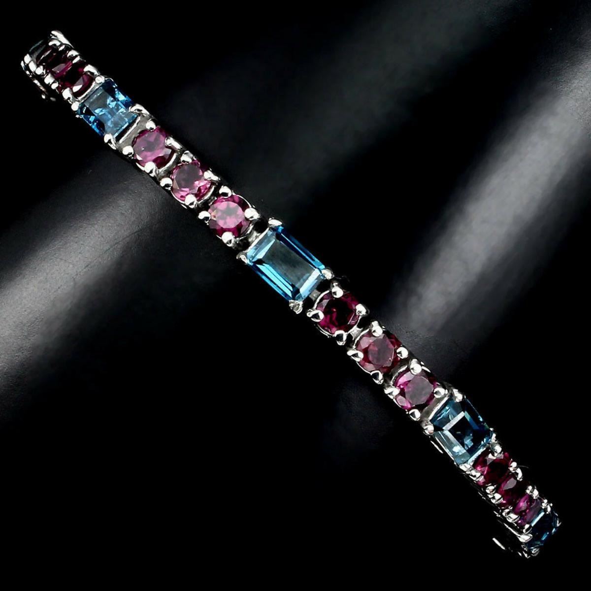 925 STERLING SILVER;PLATE14K WHITE GOLD;;LENGTH (INCHES)7.5;MAIN STONELONDON BLUE TOPAZ;OTHER GEMSRHODOLITE GARNET;TOTAL WEIGHT77.79 CT (TOTAL WEIGHT OF SILVER + STONE)DIMENSION* STONE 4.0 TO 6.0 X 4.0 MM. * FACE BRACELET 175.0 X 5.0 MM.;;MAIN STONE SHAPEOCTAGON CUT;MAIN STONE COLORTOP LONDON BLUE;CLARITY/GRADEIF TO VVS;TREATMENTHEATED;ORIGINAFRICAHARDNESS8.0;