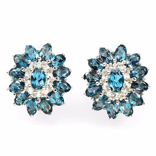 LONDON BLUE TOPAZ & WHITE TOPAZ (NATURAL) 14K WHITE GOLD COATING 925 SILVER EARRINGS; WEIGHT (CT.):48.44 CT. (total weight of silver + stone);DIMENSION:* STONE 2.0 TO 6.0 X 4.0 MM. * FACE EARRINGS 20.0 X 18.0 MM.;SHAPE/CUT:OVAL FACET & ROUND DIAMOND CUT;COLOR:TOP LONDON BLUE & TOP WHITE;CLARITY/GRADE:IF TO VVS;LUSTER:GORGEOUS;TREATMENT:HEATED & UNHEATED;ORIGIN:AFRICA & BRAZIL;HARDNESS:8.0