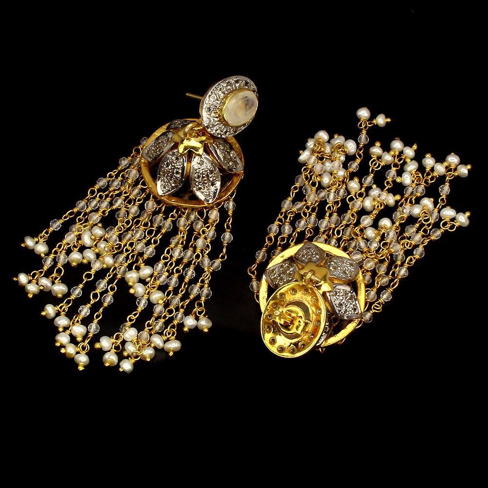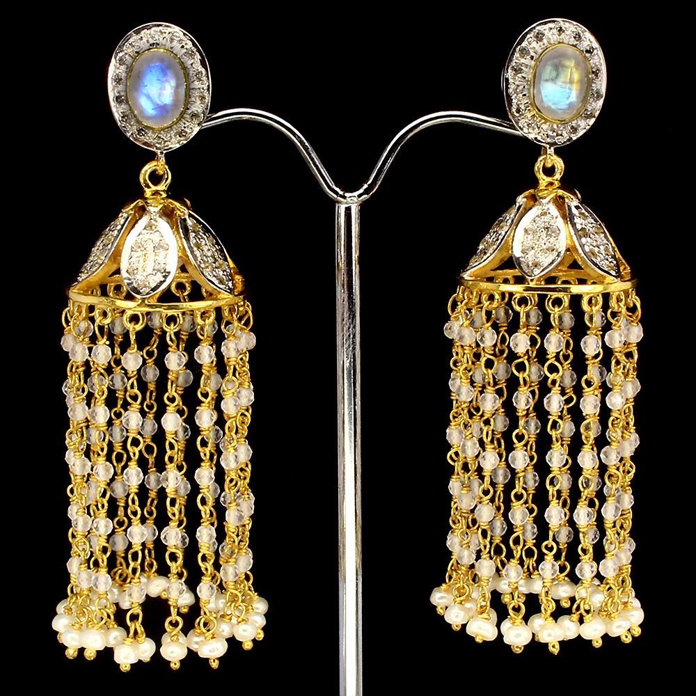 925 STERLING SILVER.........PLATE2-TONE WHITE & YELLOW 14K GOLD;MAIN STONE-MOONSTONE;OTHER GEMS-CUBIC ZIRCONIA,PEARL;TOTAL WEIGHT-117.75 CT (TOTAL WEIGHT OF SILVER + STONE)DIMENSION* STONE 1.0 TO 8.0 X 7.0 MM. * FACE EARRINGS 67.0 X 20.0 MM.;MAIN STONE SHAPE-OVAL CUT;MAIN STONE COLOR-WHITE WITH FIRE BLUE LUSTER;CLARITY/GRADE-TRANSPARENT;LUSTER-FABULOUS;TREATMENT-UNHEATED;ORIGIN- Canada;HARDNESS2.5 - 6.5