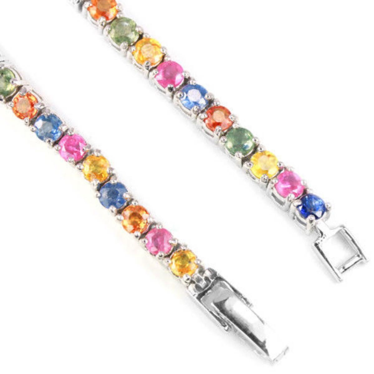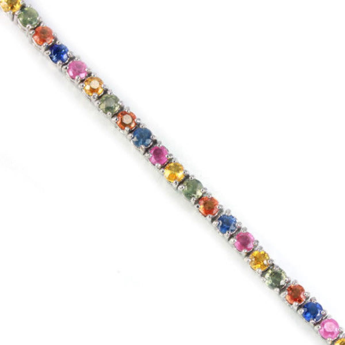 GENUINE MULTI COLOR SAPPHIRE ROUND 925 SILVER BRACELET 14K WHITE GOLD COATING; LENGTH OF ITEM (Inch.)7.75;ITEM QUANTITY1STONE SHAPEROUNDSTONE DIMENSION3 MM.ITEM WEIGHT11.7 GRAMCOLORMULTI COLORCLARITYTRANSLUCENT & VS-SILUSTERALLURINGTREATMENTHEATEDORIGIN OF STONE AFRICAHARDNESS9.0