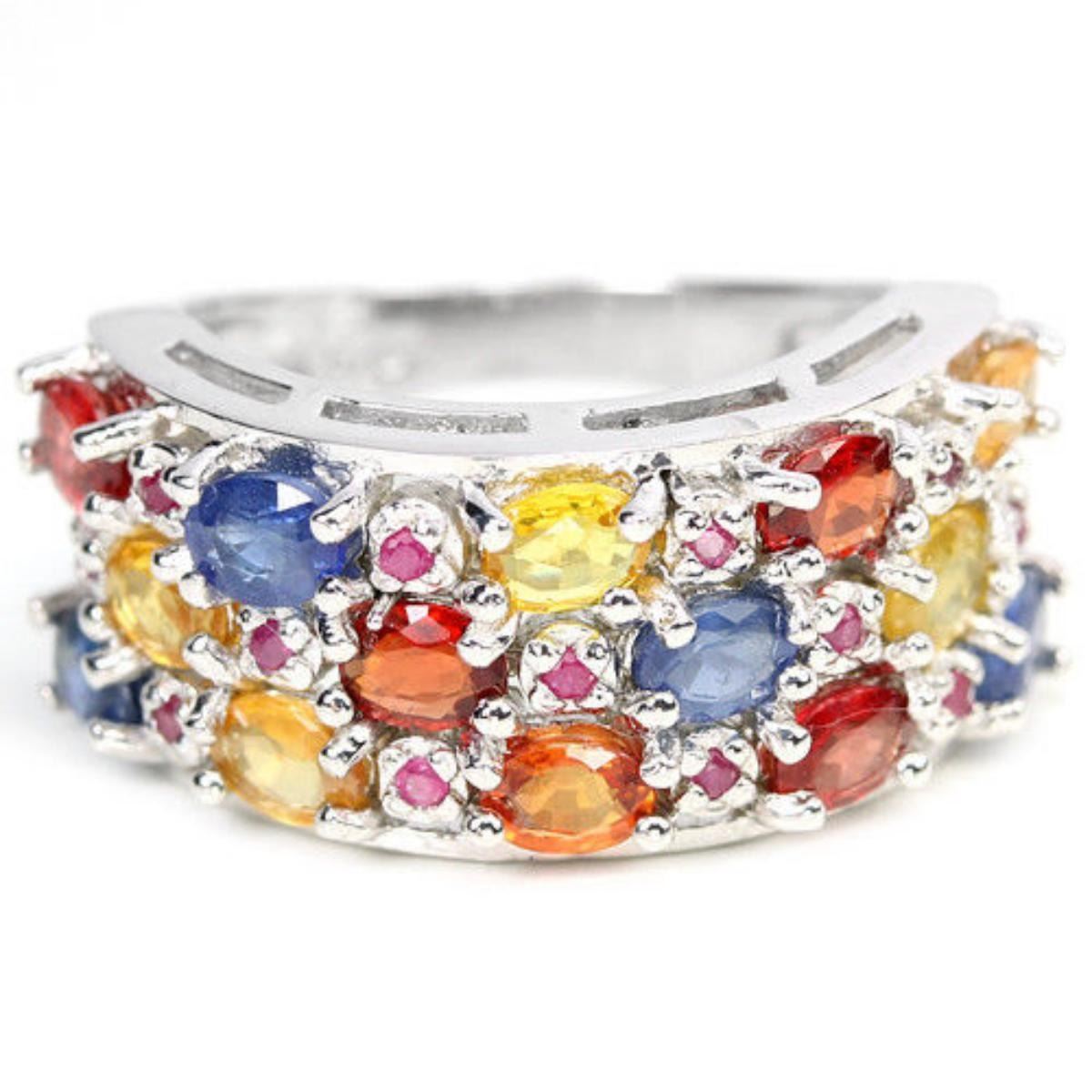 MULTI COLOR SAPPHIRE RUBY 925 SILVER RING 14K WHITE GOLD COATING; RING SIZE- 6.75 ( can be resized ) ITEM QUANTITY 1 STONE SHAPE OVAL ROUND FACET CUT STONE DIMENSION 4 X 3 MM. , 1.2 MM. ITEM WEIGHT 6.36 GRAM COLOR MULTI COLOR CLARITY VVS-SI TRANSLUCENT LUSTER ENCHANTING TREATMENT HEATED HARDNESS 9 FACE OF RING 25 X 10 MM.