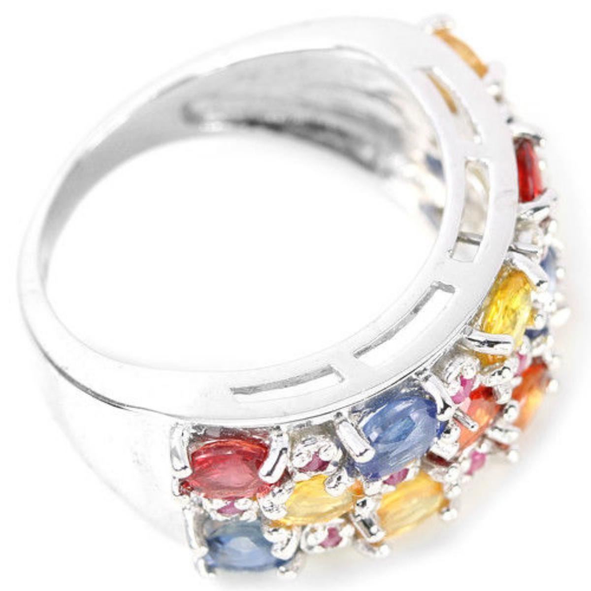 MULTI COLOR SAPPHIRE RUBY 925 SILVER RING 14K WHITE GOLD COATING; RING SIZE- 6.75 ( can be resized ) ITEM QUANTITY 1 STONE SHAPE OVAL ROUND FACET CUT STONE DIMENSION 4 X 3 MM. , 1.2 MM. ITEM WEIGHT 6.36 GRAM COLOR MULTI COLOR CLARITY VVS-SI TRANSLUCENT LUSTER ENCHANTING TREATMENT HEATED HARDNESS 9 FACE OF RING 25 X 10 MM.