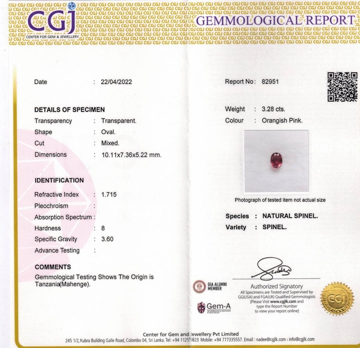 Natural Padparadscha Spinel 3.28 Cts - Untreated/Certified..Shape - Oval..size 10.11 x 7.36 x 5.22 MM; origin Mahenge/Tanzania; 100 Percent Natural Untreated .... Clarity - eye clean