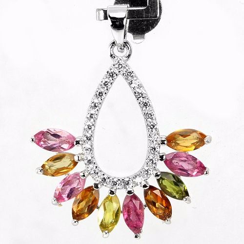 NATURAL MULTI COLOR TOURMALINE & CZ 925 SILVER PENDANT 14K WHITE GOLD COATING; STONE SHAPEMARQUISE PORTUGESE CUTSTONE DIMENSION5 X 2.5 MM.MAIN STONE WEIGHT1.58 CARATCOLORMULTI COLORCLARITYVVS, VS - SI 1LUSTERALLURINGTREATMENTUNHEATEDORIGIN OF STONEAFRICAHARDNESS7.5OTHERFACE OF PENDANT 26 X 20 MM. WHITE CUBIC ZIRCONIA 1 MM. TOTAL 1.75 G.